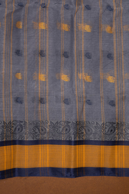 Chaayabrita - Grey Bengal Cotton Saree with Navy Blue & Mustard Floral Border