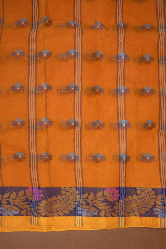 Amrapaali – Marigold Yellow Bengal Cotton Saree with Royal Purple Floral Border