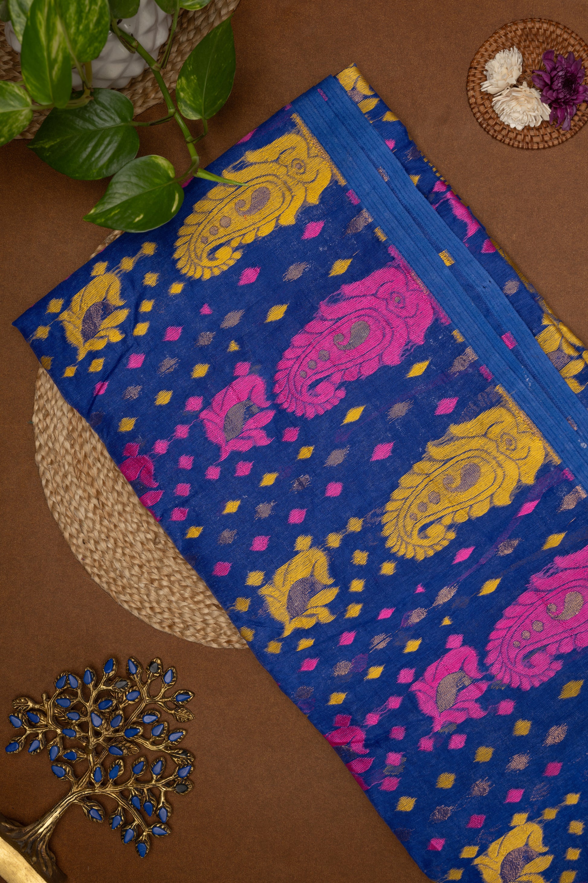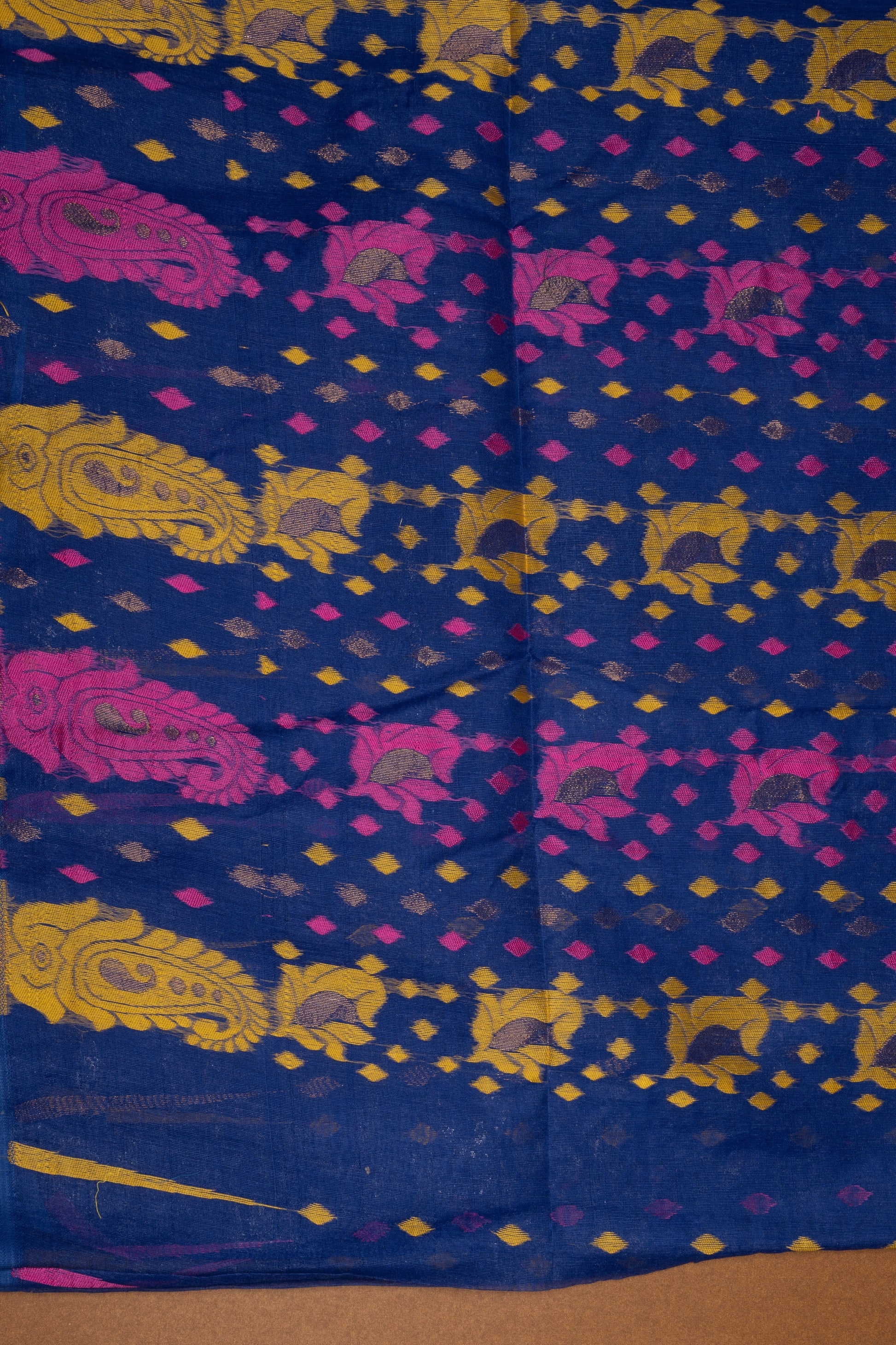 Bathed in the stunning glow of Royal Blue , this Jamdani saree is a whisper of heritage woven into every thread. The fabric embodies purity and serenity, reminiscent of ivory sands under golden light. What makes this piece exceptional is its kolka & phool motif arrangement—a striking departure from the conventional grid of Jamdani, lending the drape a dynamic rhythm and sense of movement.