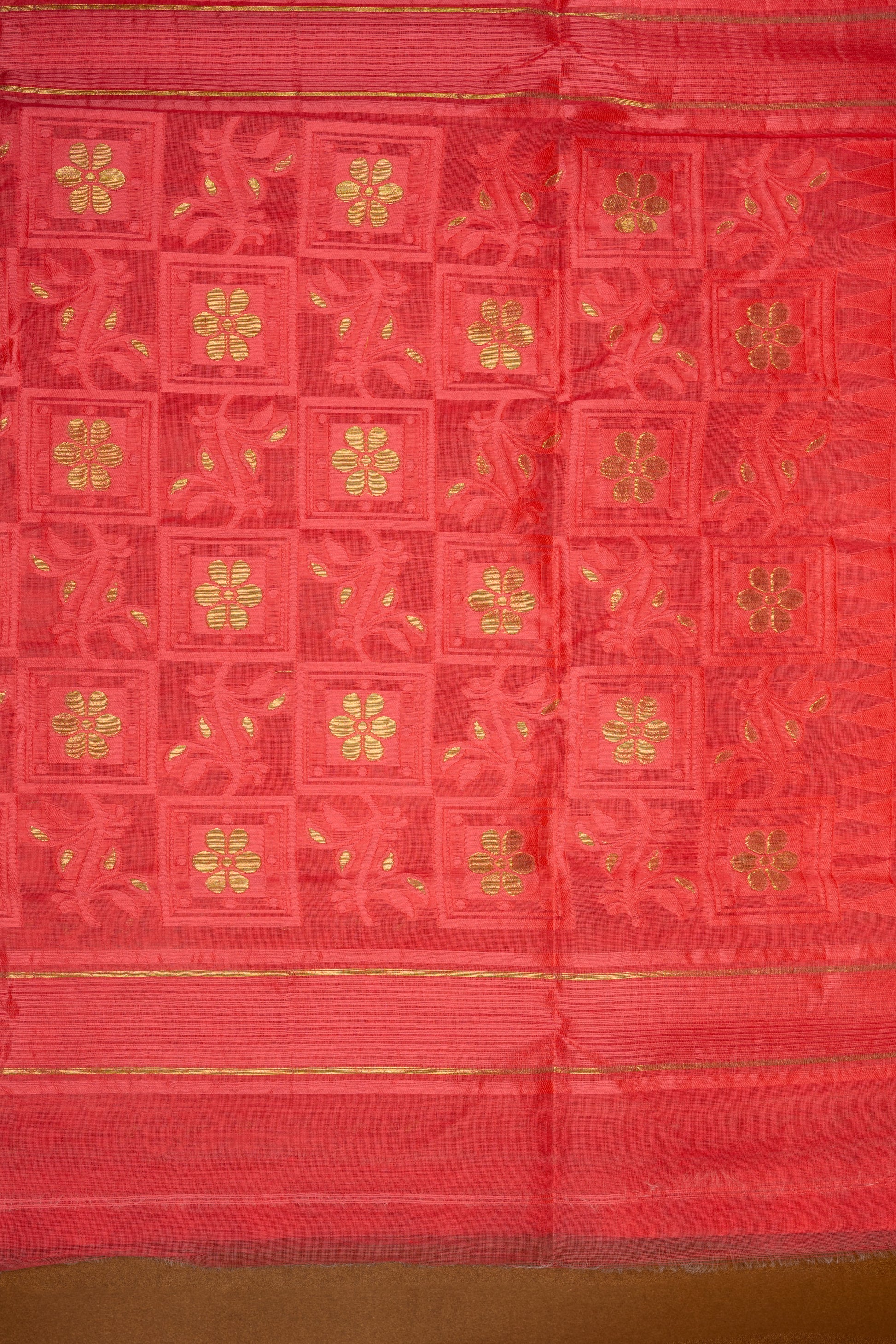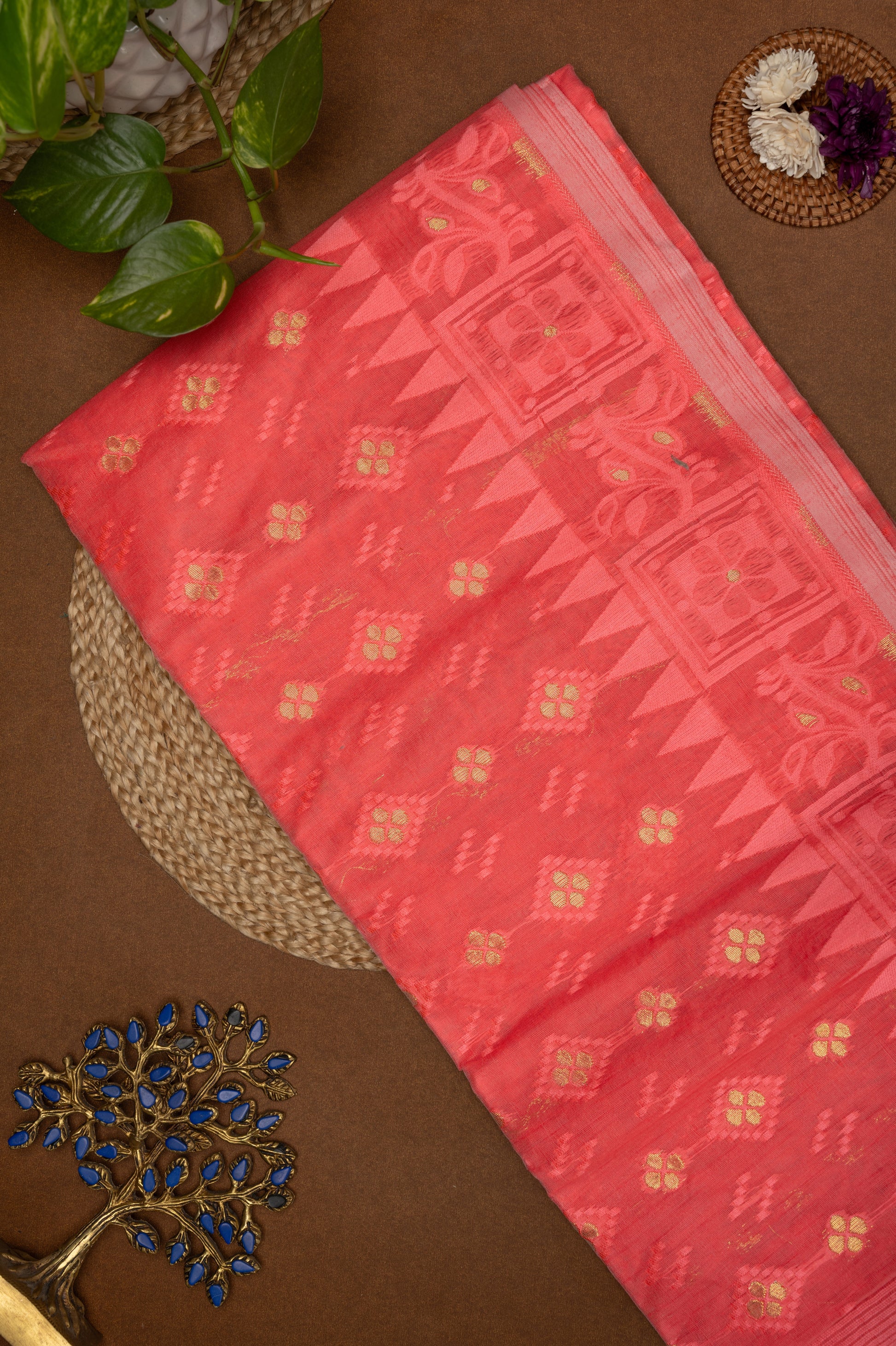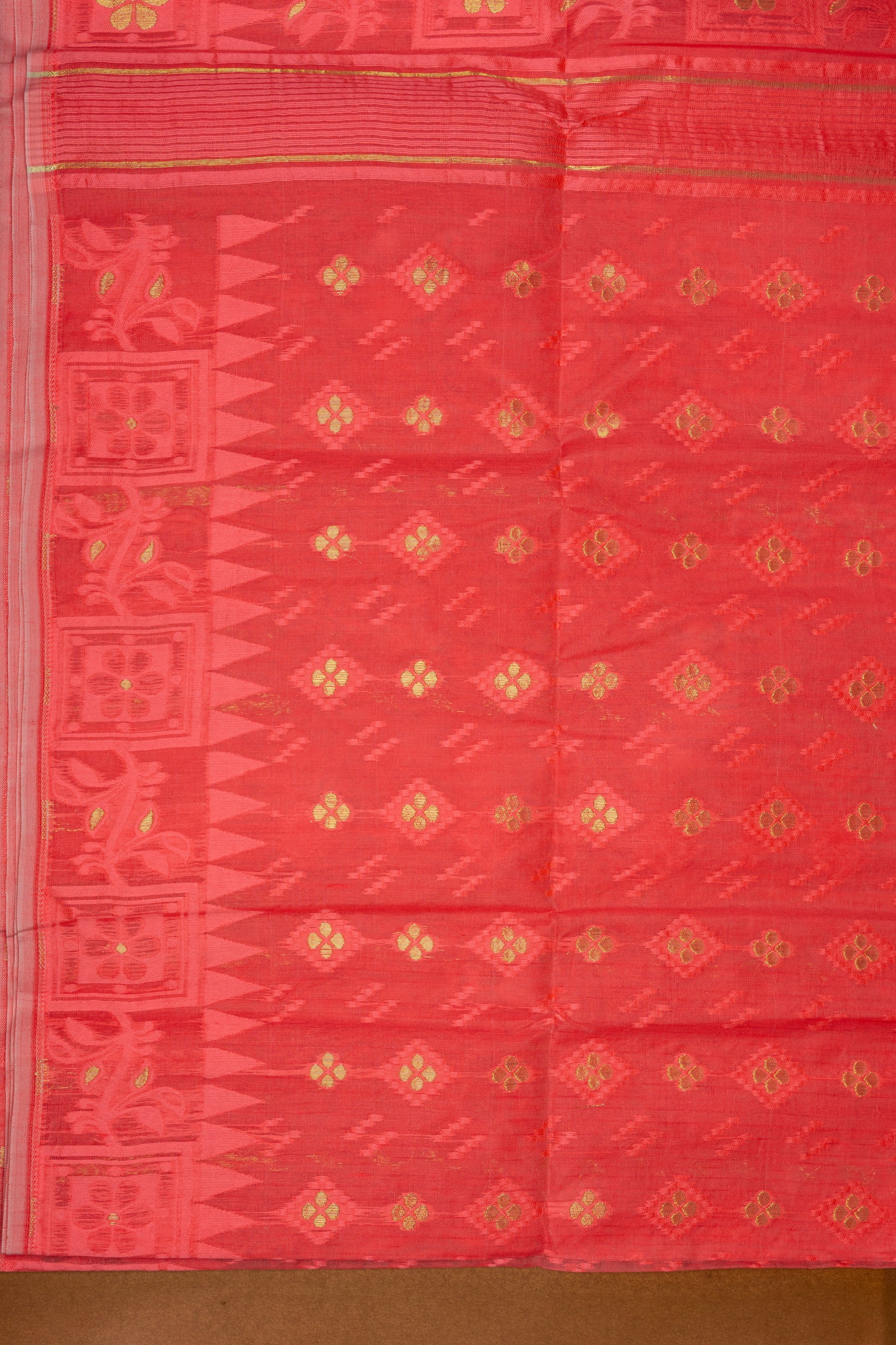 Bathed in the stunning glow of coral pink , this Jamdani saree is a whisper of heritage woven into every thread. The fabric embodies purity and serenity, reminiscent of ivory sands under golden light. What makes this piece exceptional is its zari booti motif arrangement—a striking departure from the conventional grid of Jamdani, lending the drape a dynamic rhythm and sense of movement.