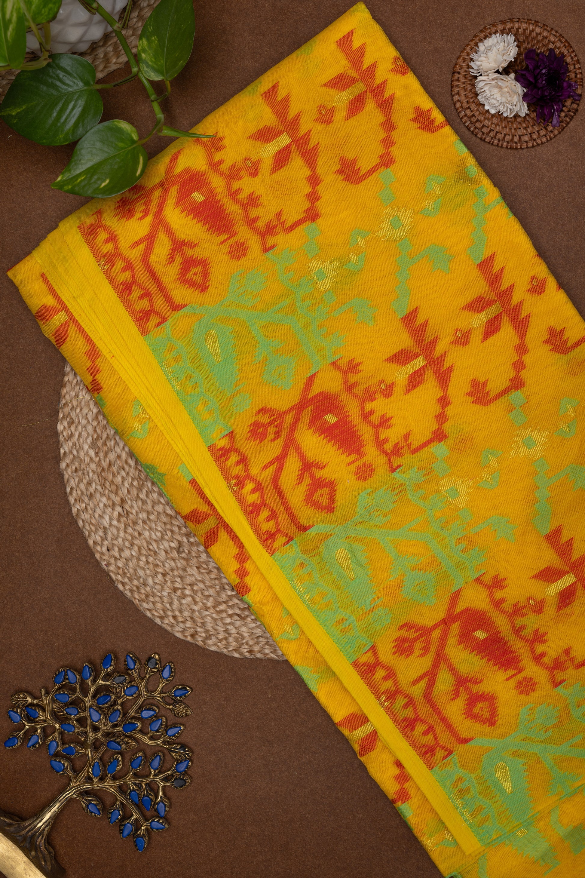 Bathed in the subtle glow of sunshine yellow , this Jamdani saree is a whisper of heritage woven into every thread. The fabric embodies purity and serenity, reminiscent of ivory sands under golden light. What makes this piece exceptional is its diagonal geometric motif arrangement—a striking departure from the conventional grid of Jamdani, lending the drape a dynamic rhythm and sense of movement.