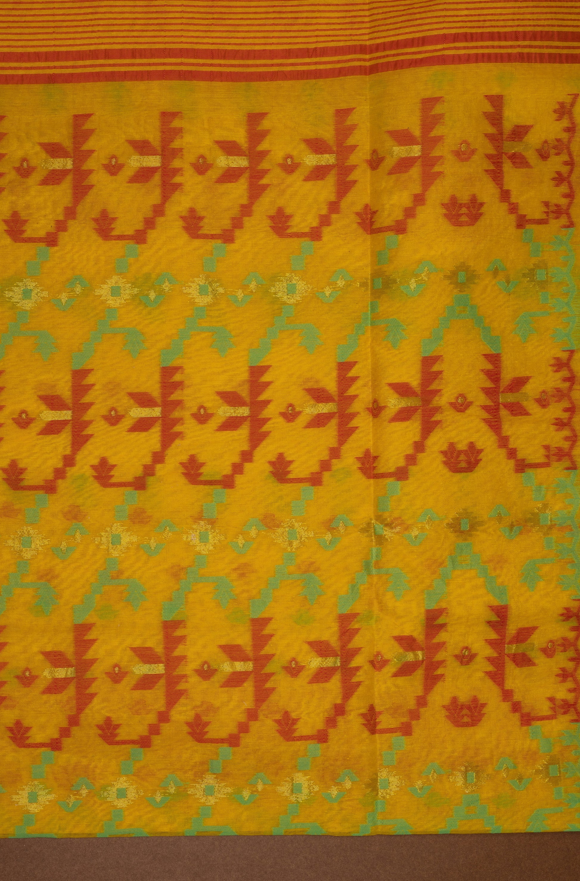 very motif is the result of supplementary weft weaving, where artisans interlace threads with the base yarn, without any mechanical aid. It is said that a single Jamdani saree can take anywhere from 120 to 200 hours, depending on intricacy, and this diagonal composition demands even greater precision.