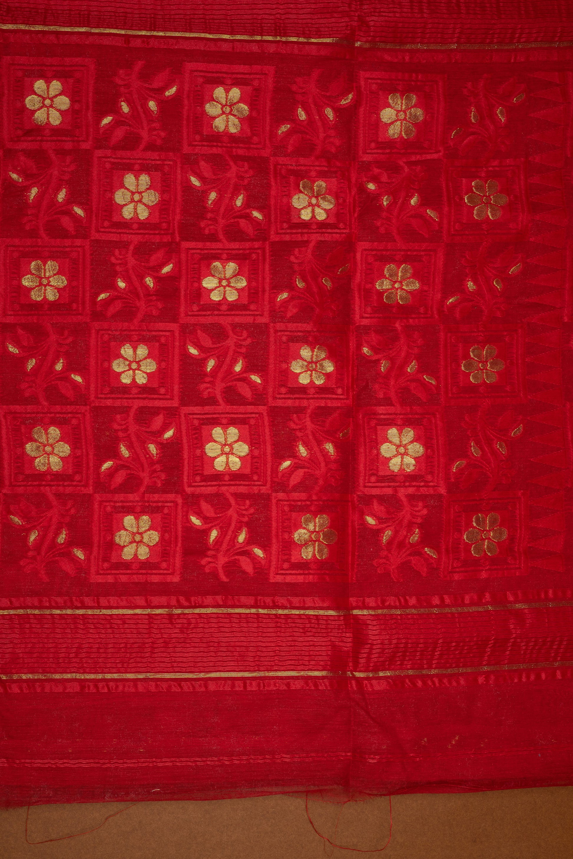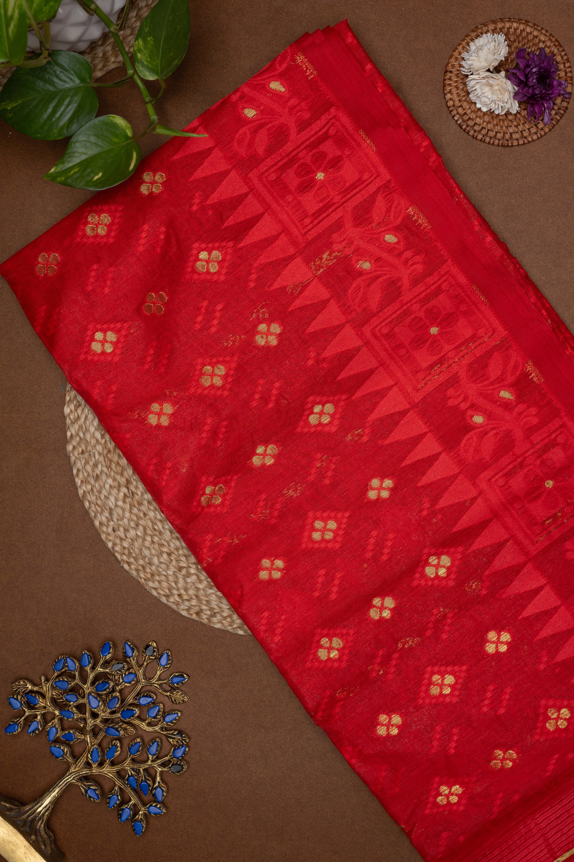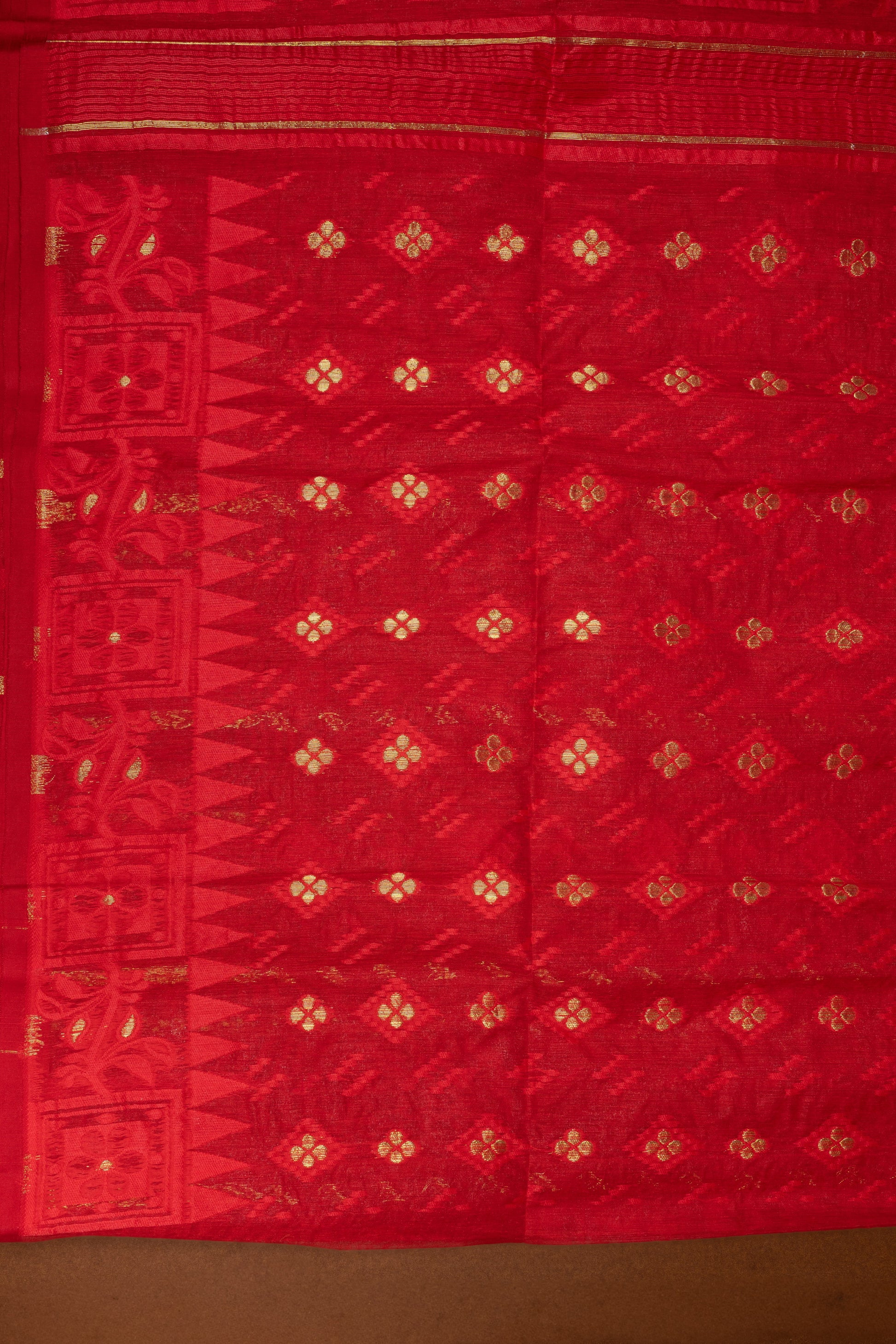 Bathed in the stunning glow of true red , this Jamdani saree is a whisper of heritage woven into every thread. The fabric embodies purity and serenity, reminiscent of ivory sands under golden light. What makes this piece exceptional is its zari booti motif arrangement—a striking departure from the conventional grid of Jamdani, lending the drape a dynamic rhythm and sense of movement.