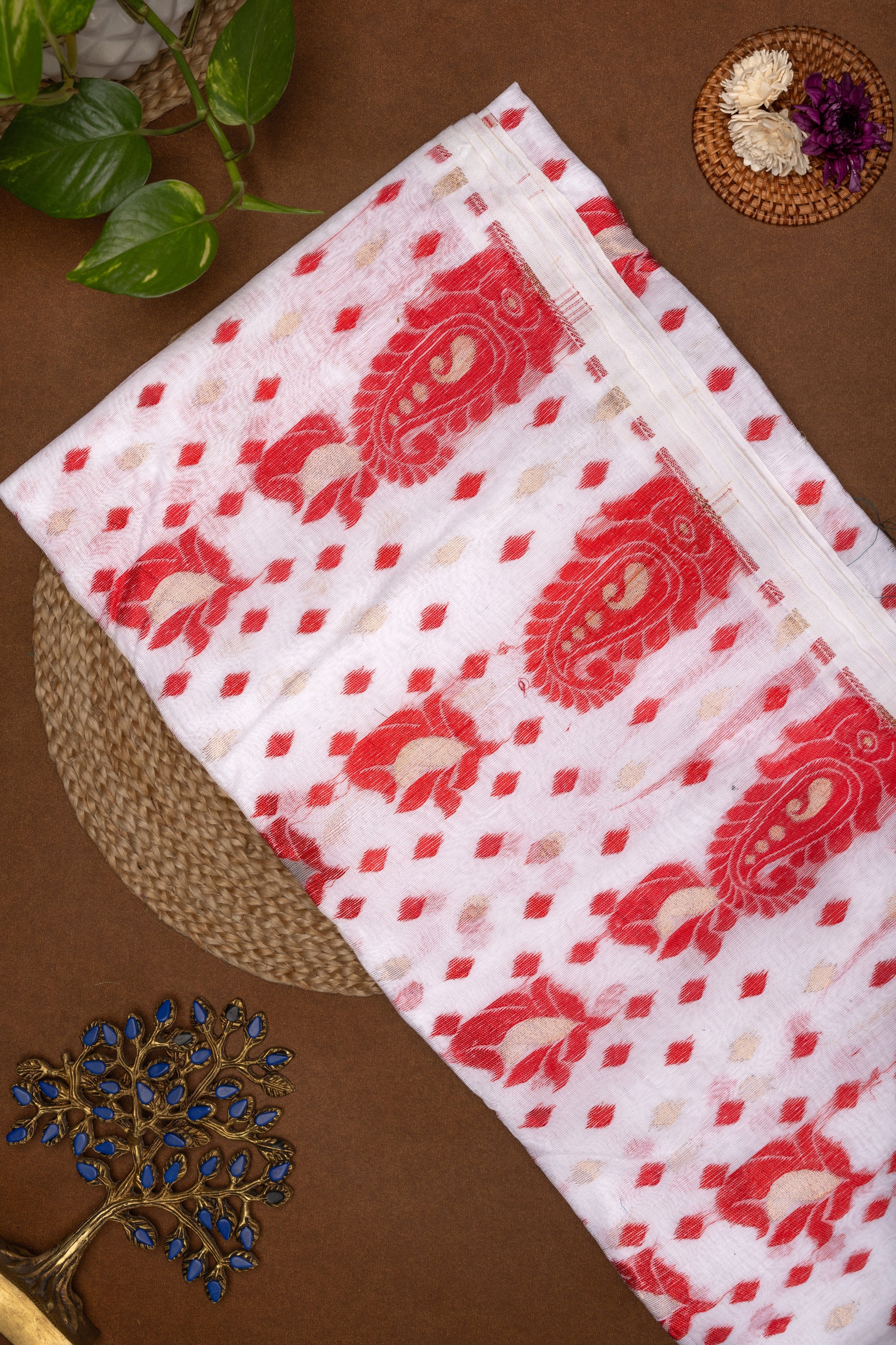 Bathed in the subtle glow of ivory , this Jamdani saree is a whisper of heritage woven into every thread. The fabric embodies purity and serenity, reminiscent of ivory sands under golden light. What makes this piece exceptional is its kolka & phool motif arrangement—a striking departure from the conventional grid of Jamdani, lending the drape a dynamic rhythm and sense of movement.