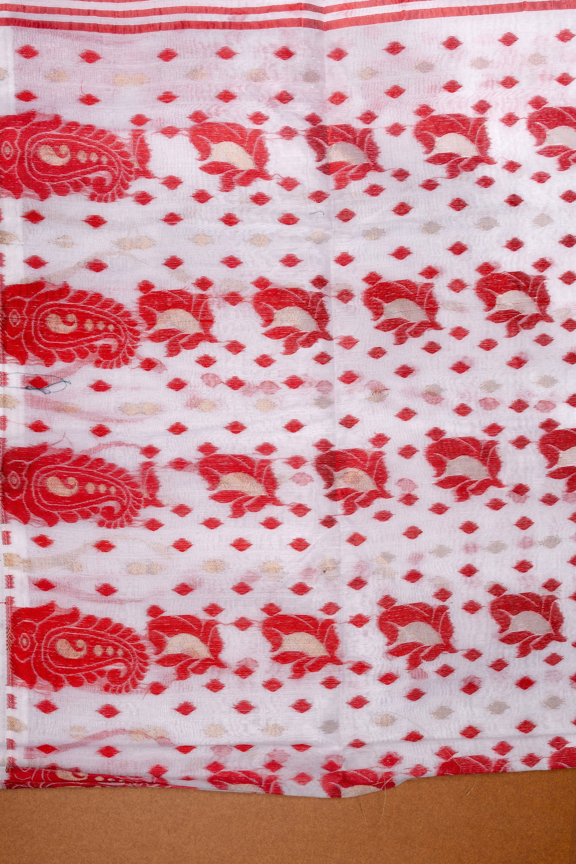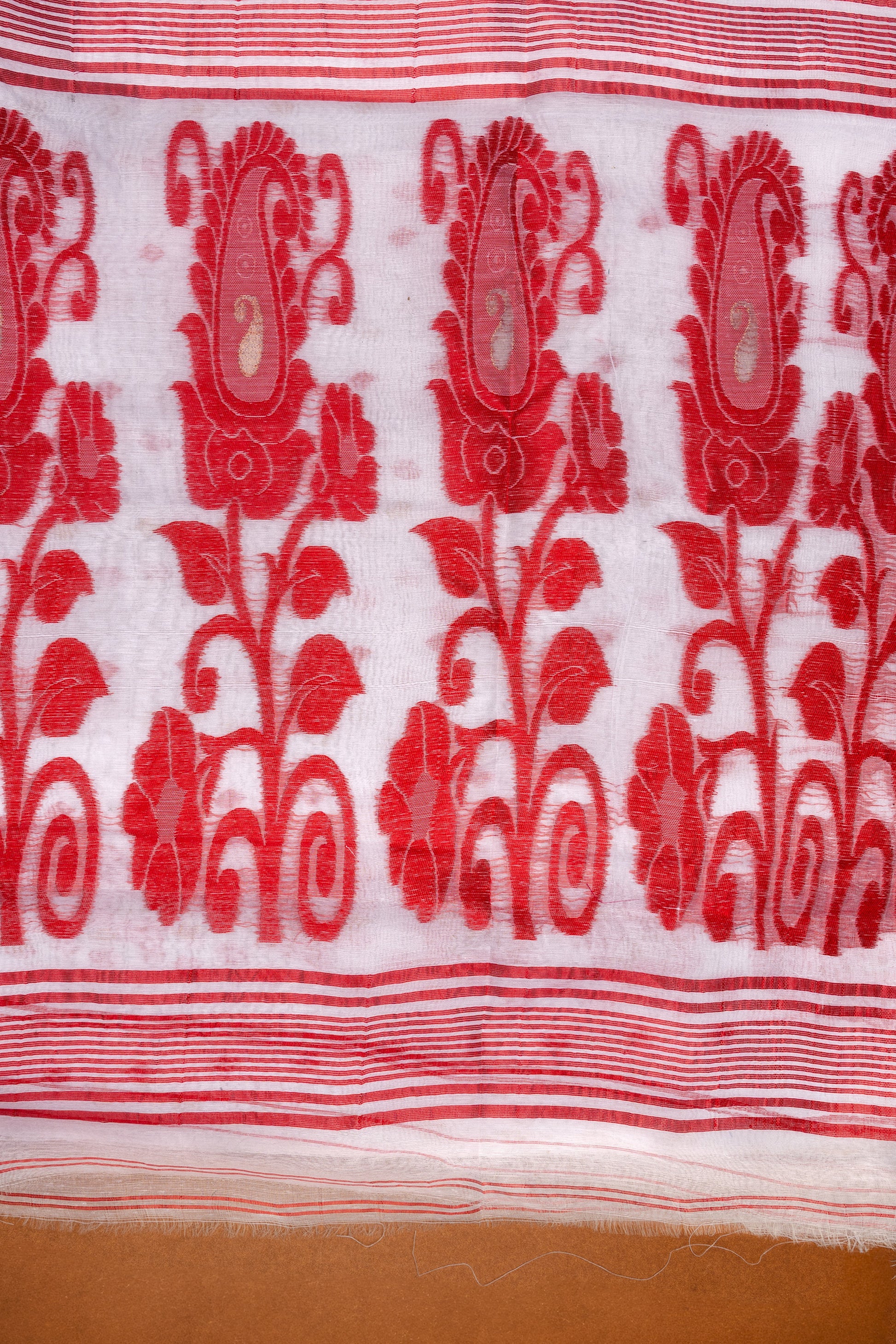 very motif is the result of supplementary weft weaving, where artisans interlace threads with the base yarn, without any mechanical aid. It is said that a single Jamdani saree can take anywhere from 120 to 200 hours, depending on intricacy, and this diagonal composition demands even greater precision.