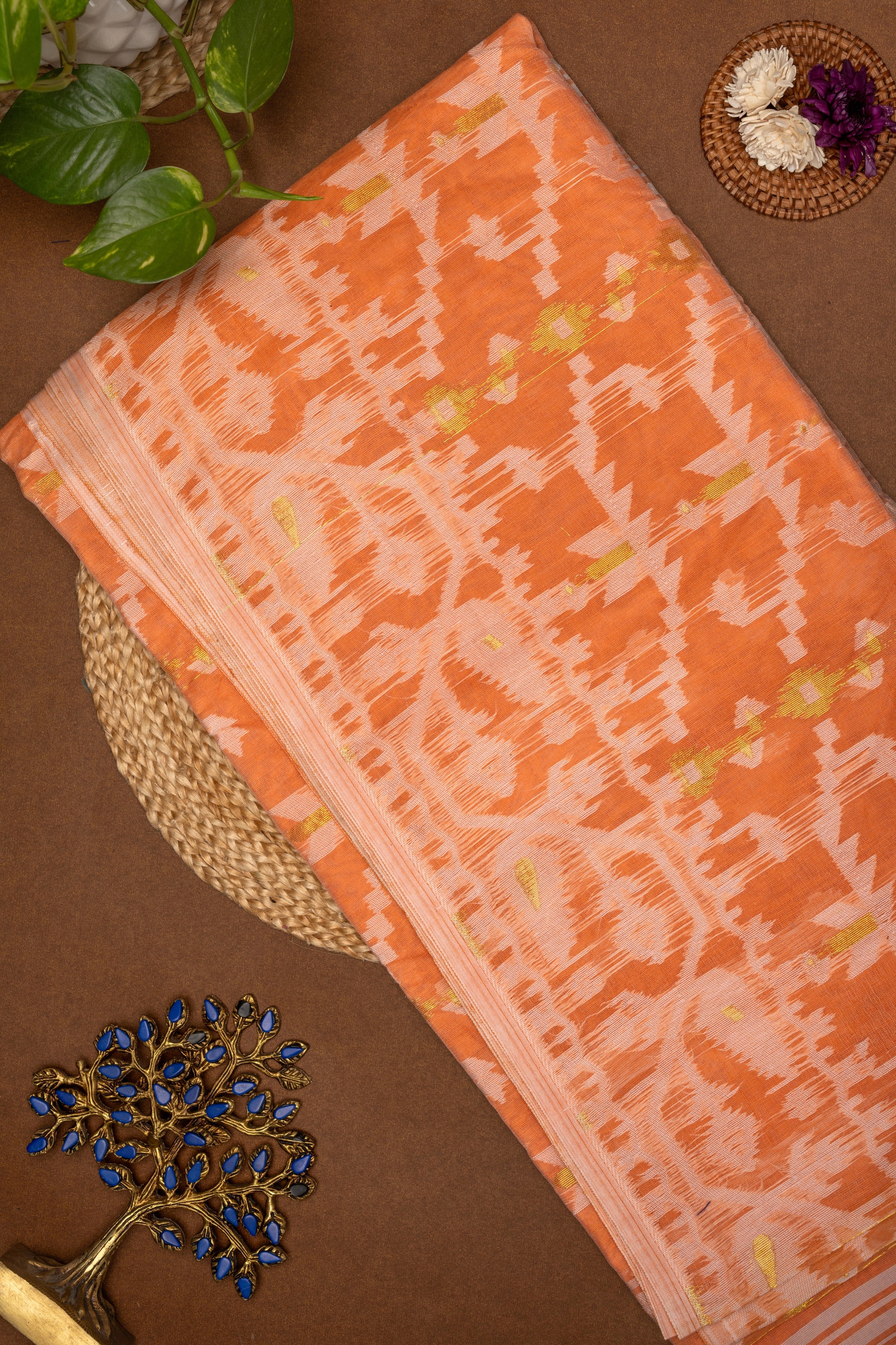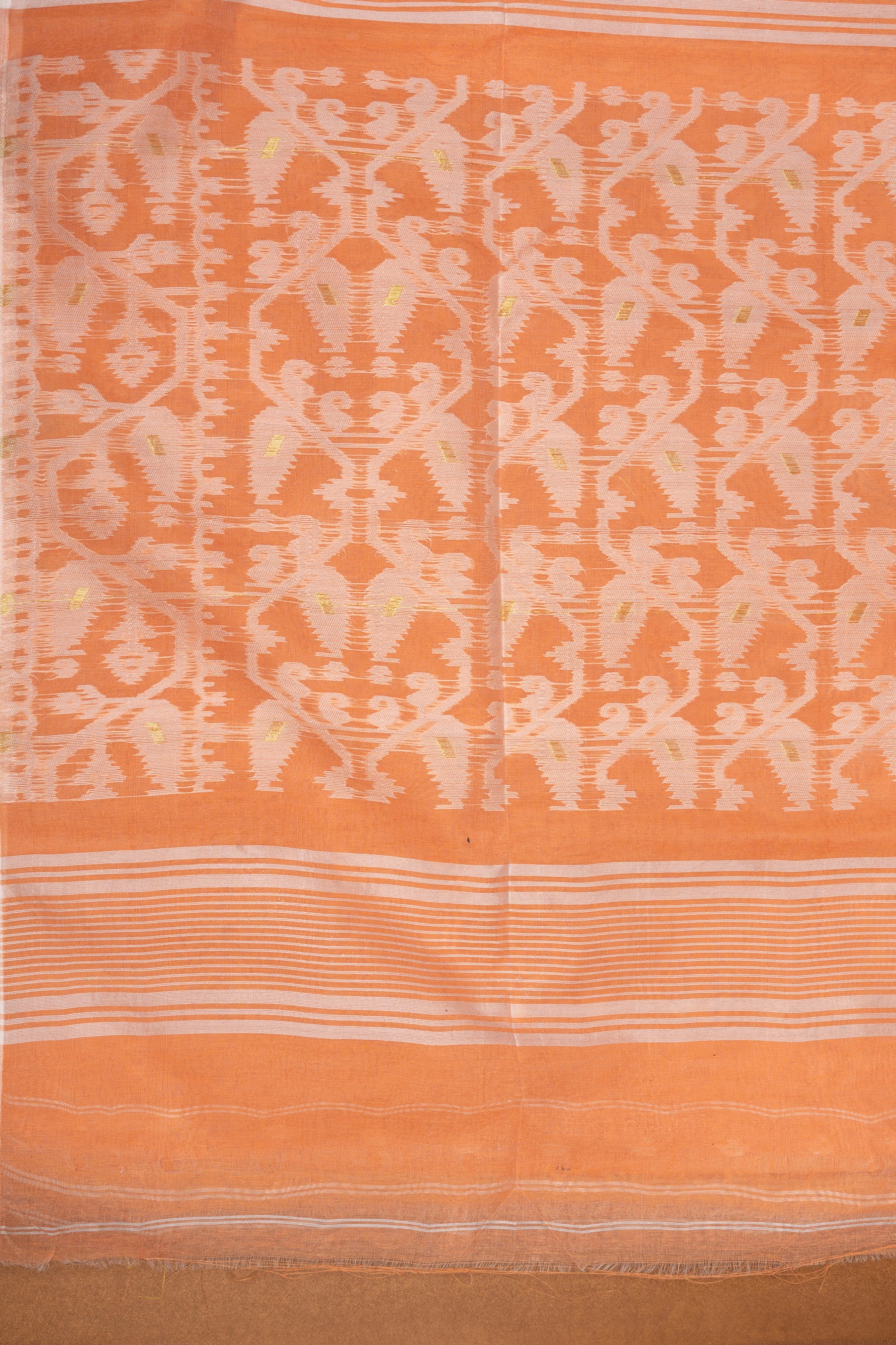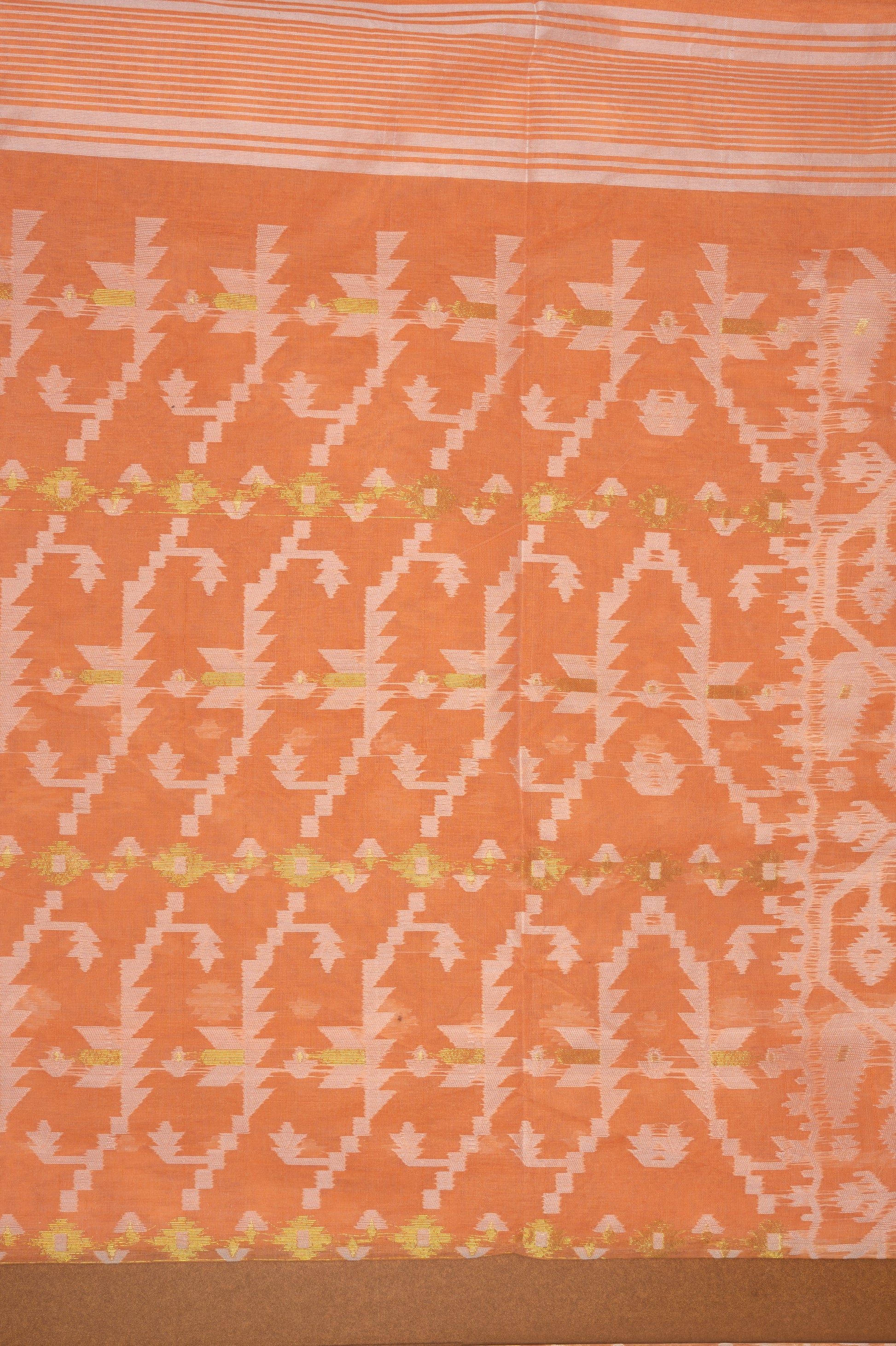 Bathed in the subtle glow of peach , this Jamdani saree is a whisper of heritage woven into every thread. The fabric embodies purity and serenity, reminiscent of ivory sands under golden light. What makes this piece exceptional is its diagonal geometric motif arrangement—a striking departure from the conventional grid of Jamdani, lending the drape a dynamic rhythm and sense of movement.