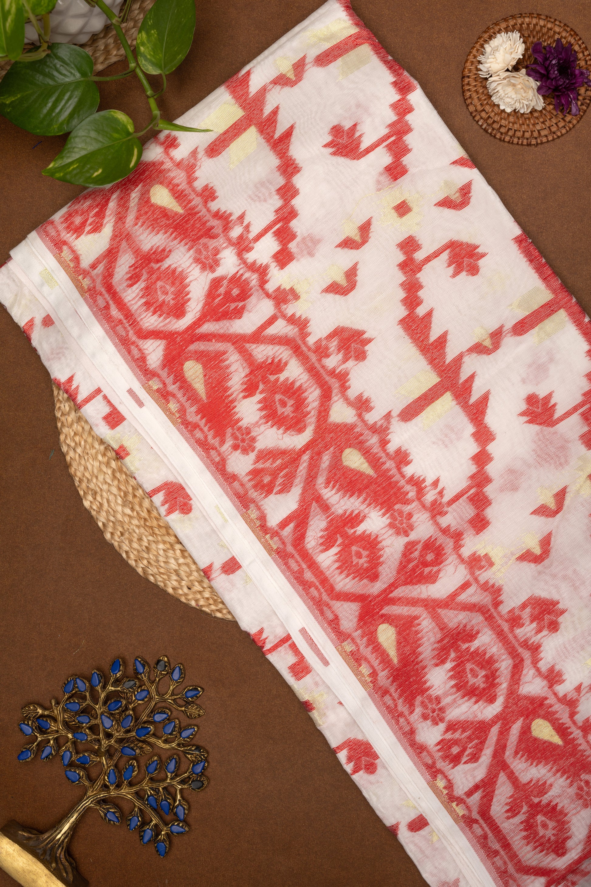 Bathed in the subtle glow of ivory , this Jamdani saree is a whisper of heritage woven into every thread. The fabric embodies purity and serenity, reminiscent of ivory sands under golden light. What makes this piece exceptional is its diagonal geometrical motif arrangement—a striking departure from the conventional grid of Jamdani, lending the drape a dynamic rhythm and sense of movement.