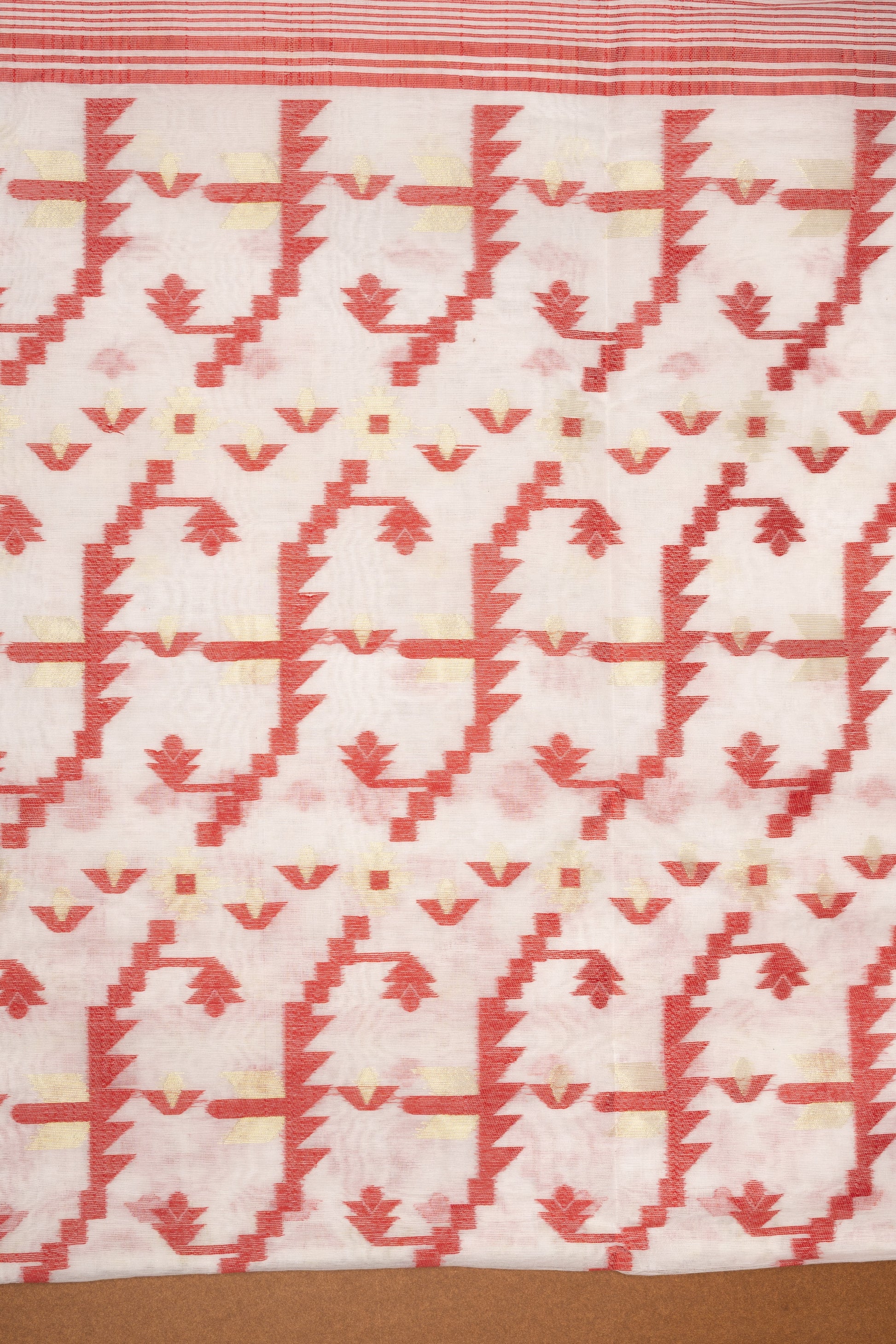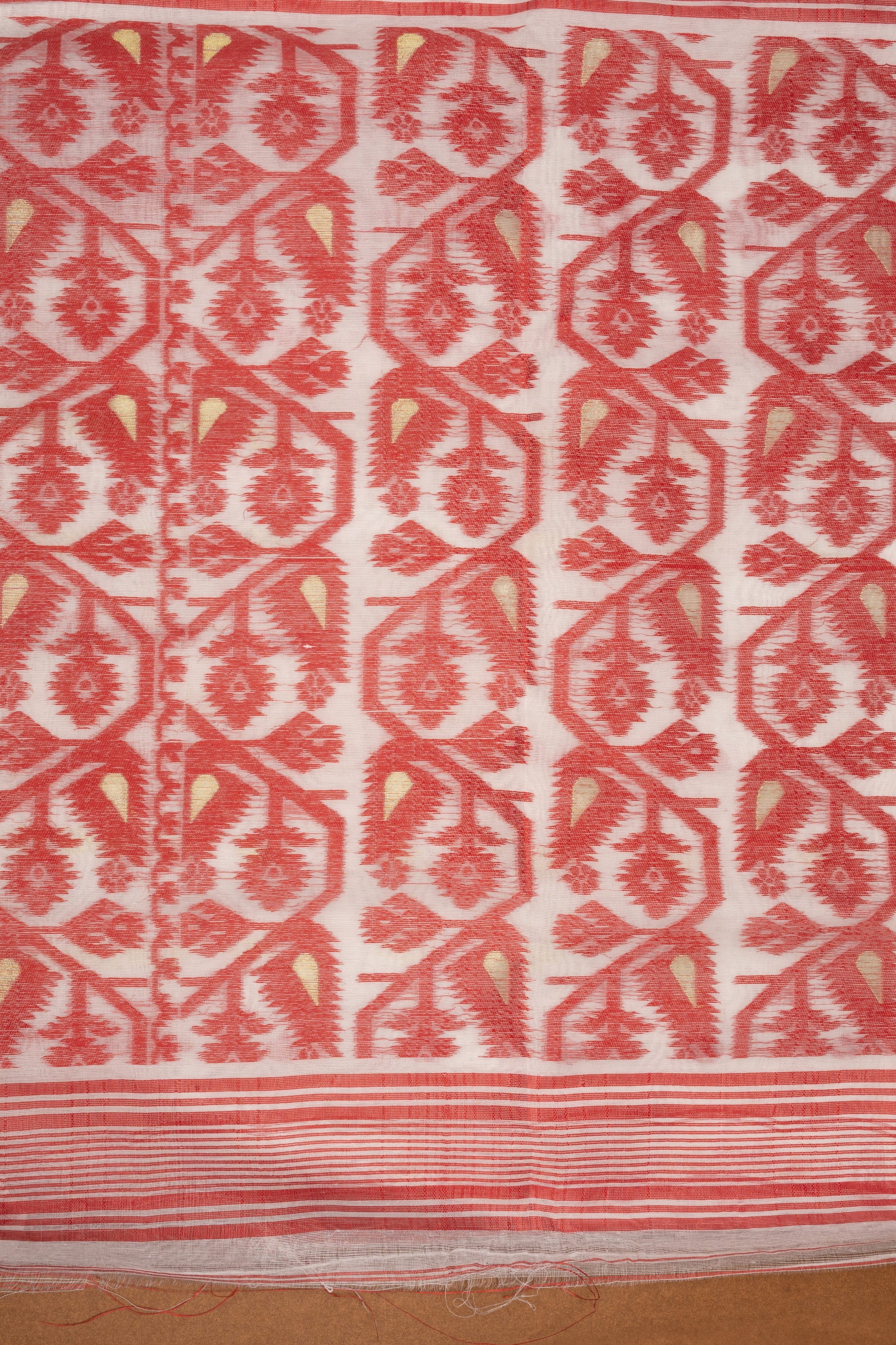 very motif is the result of supplementary weft weaving, where artisans interlace threads with the base yarn, without any mechanical aid. It is said that a single Jamdani saree can take anywhere from 120 to 200 hours, depending on intricacy, and this diagonal composition demands even greater precision.