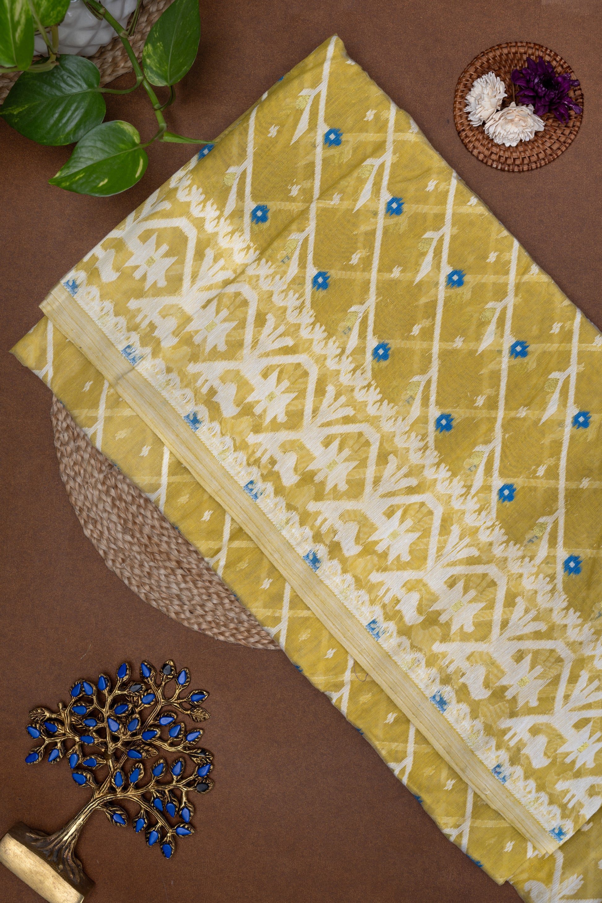 Bathed in the subtle glow of lemon yellow , this Jamdani saree is a whisper of heritage woven into every thread. The fabric embodies purity and serenity, reminiscent of ivory sands under golden light. What makes this piece exceptional is its meenakaari tulip diagonal motif arrangement—a striking departure from the conventional grid of Jamdani, lending the drape a dynamic rhythm and sense of movement.