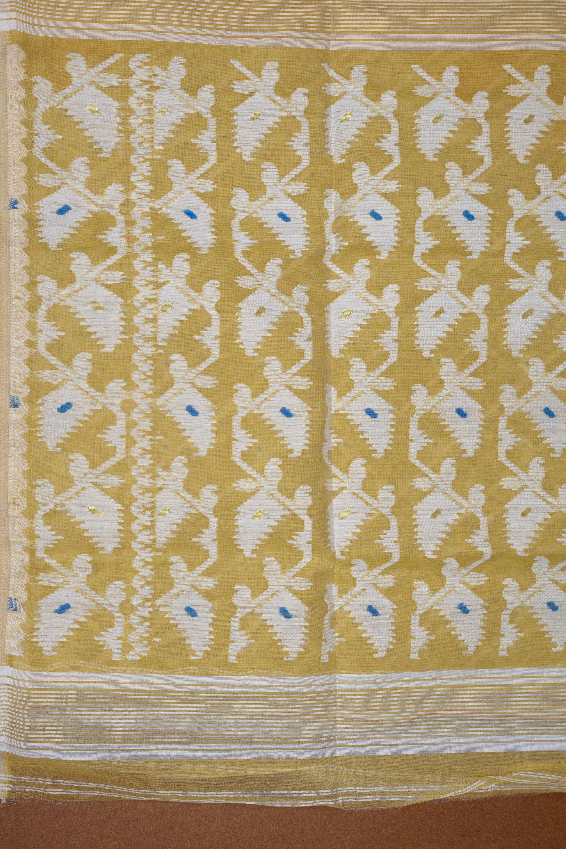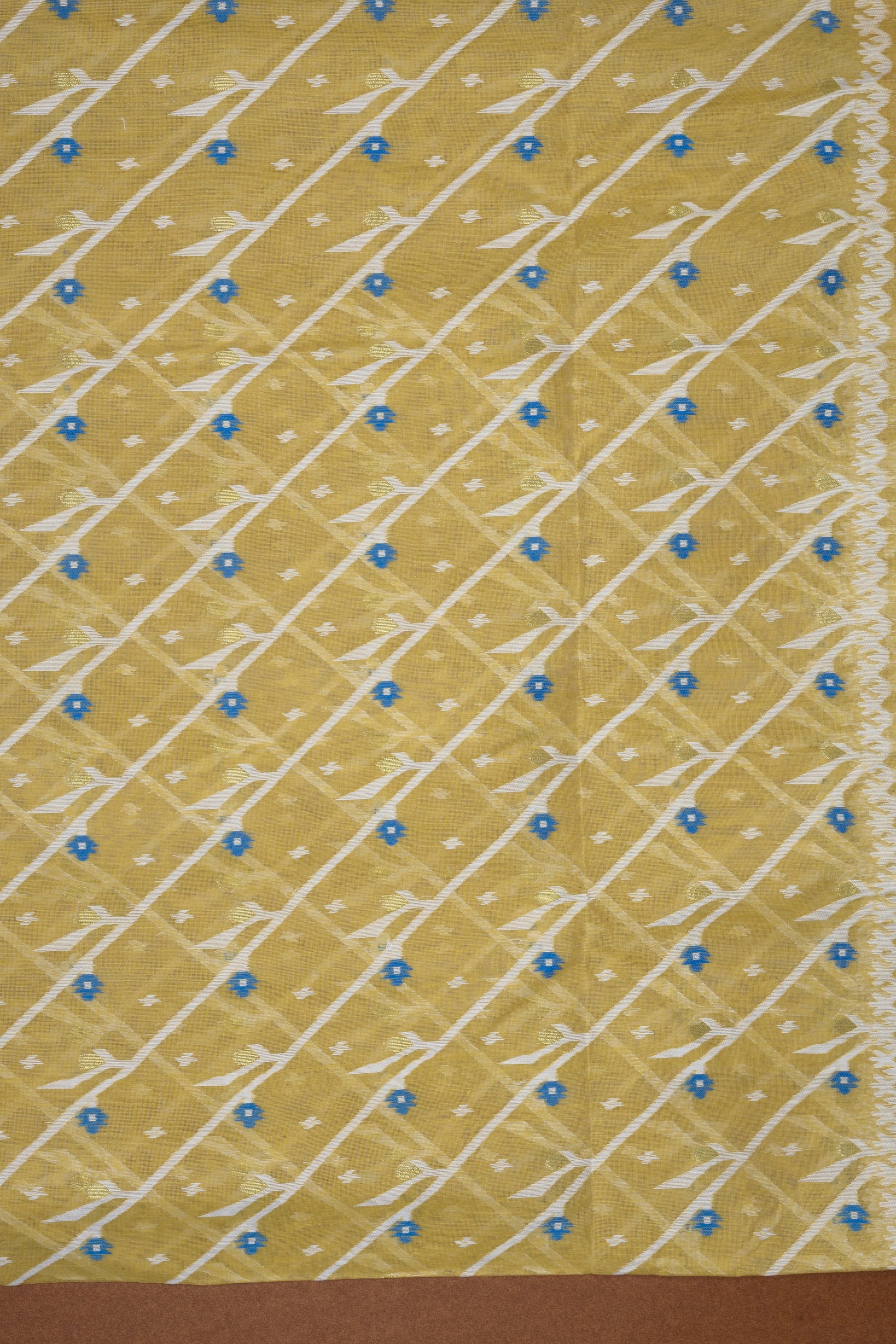 very motif is the result of supplementary weft weaving, where artisans interlace threads with the base yarn, without any mechanical aid. It is said that a single Jamdani saree can take anywhere from 120 to 200 hours, depending on intricacy, and this diagonal composition demands even greater precision.