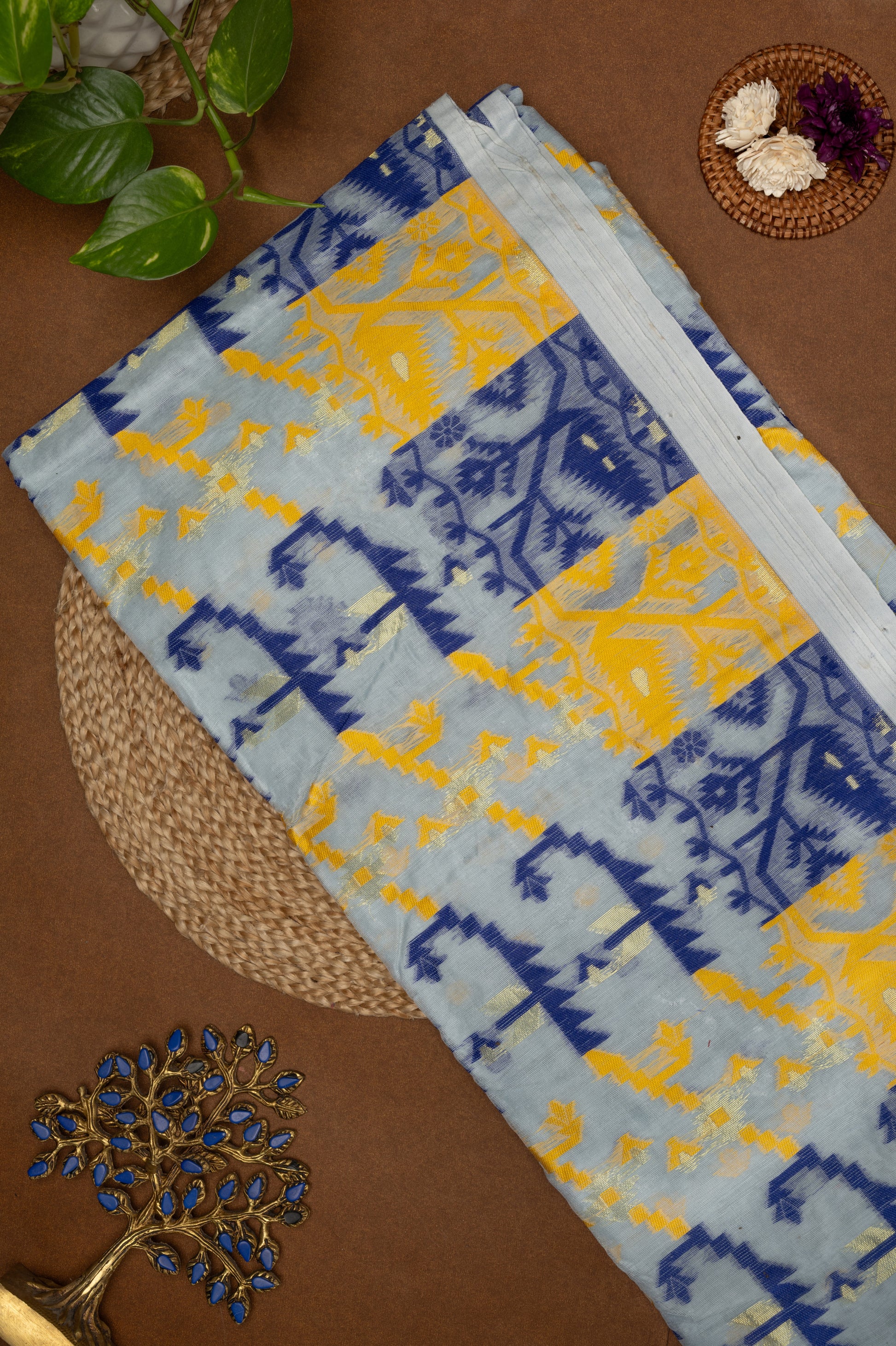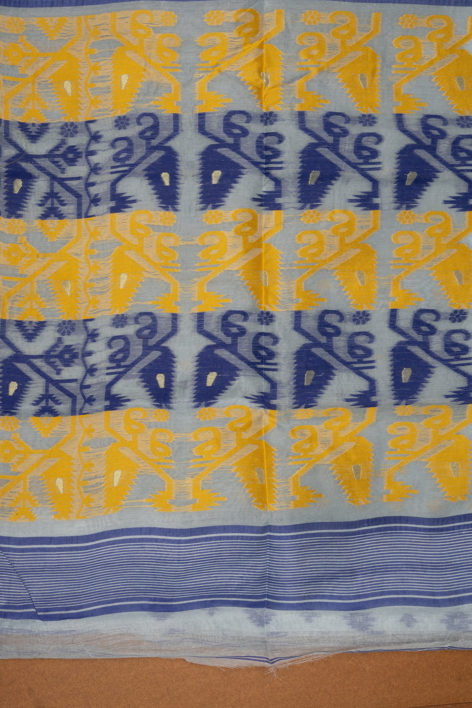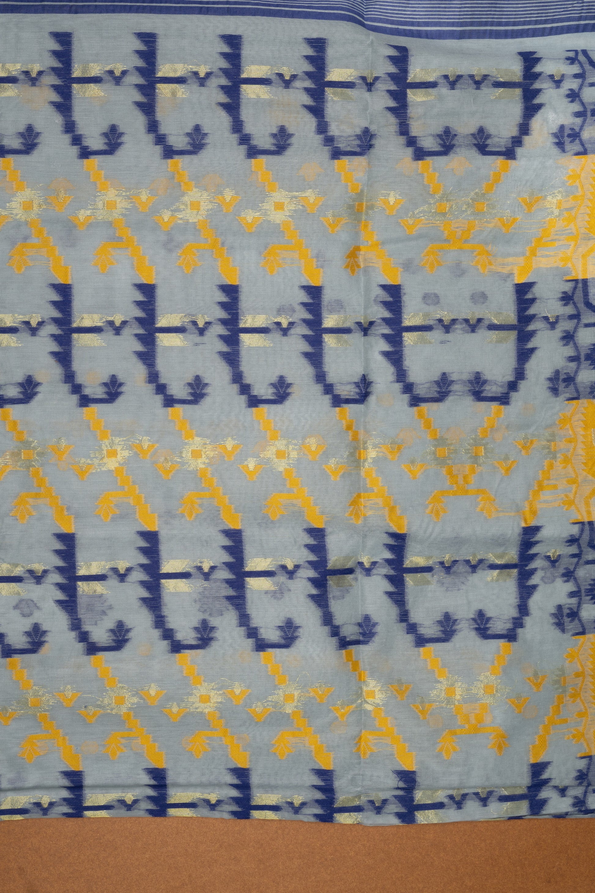 Bathed in the stunning glow of grey, this Jamdani saree is a whisper of heritage woven into every thread. The fabric embodies purity and serenity, reminiscent of ivory sands under golden light. What makes this piece exceptional is its diagonal geometrical motif arrangement—a striking departure from the conventional grid of Jamdani, lending the drape a dynamic rhythm and sense of movement.
