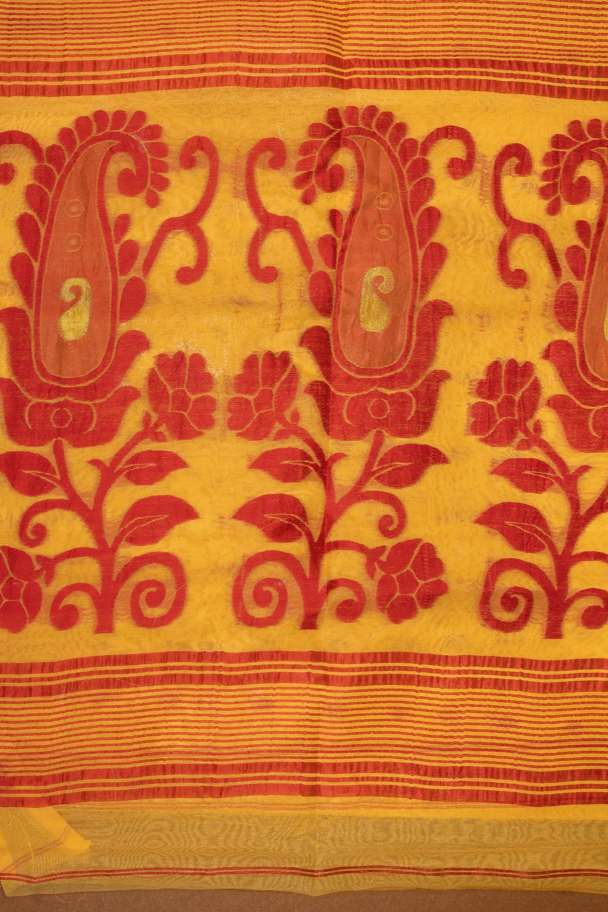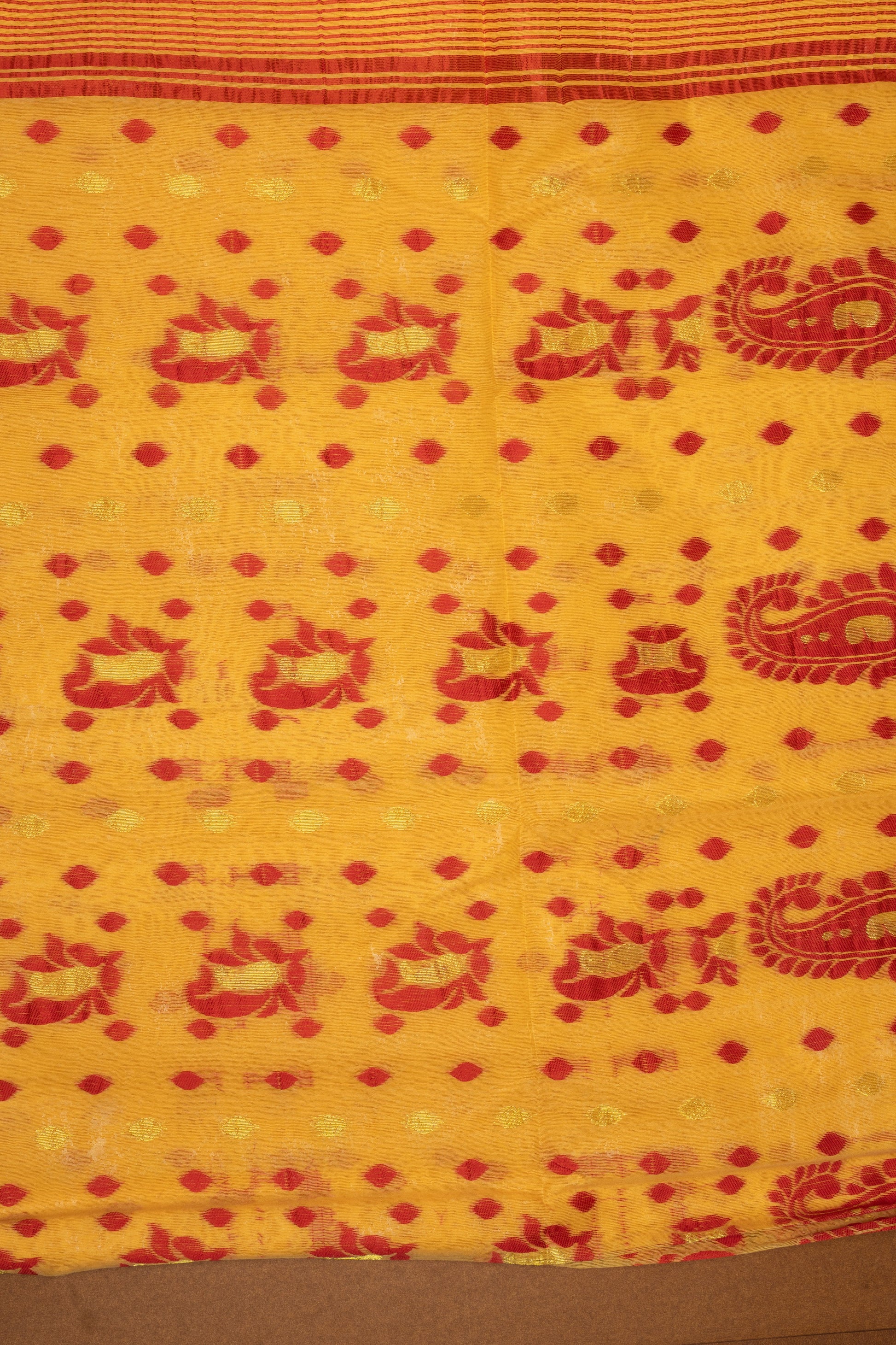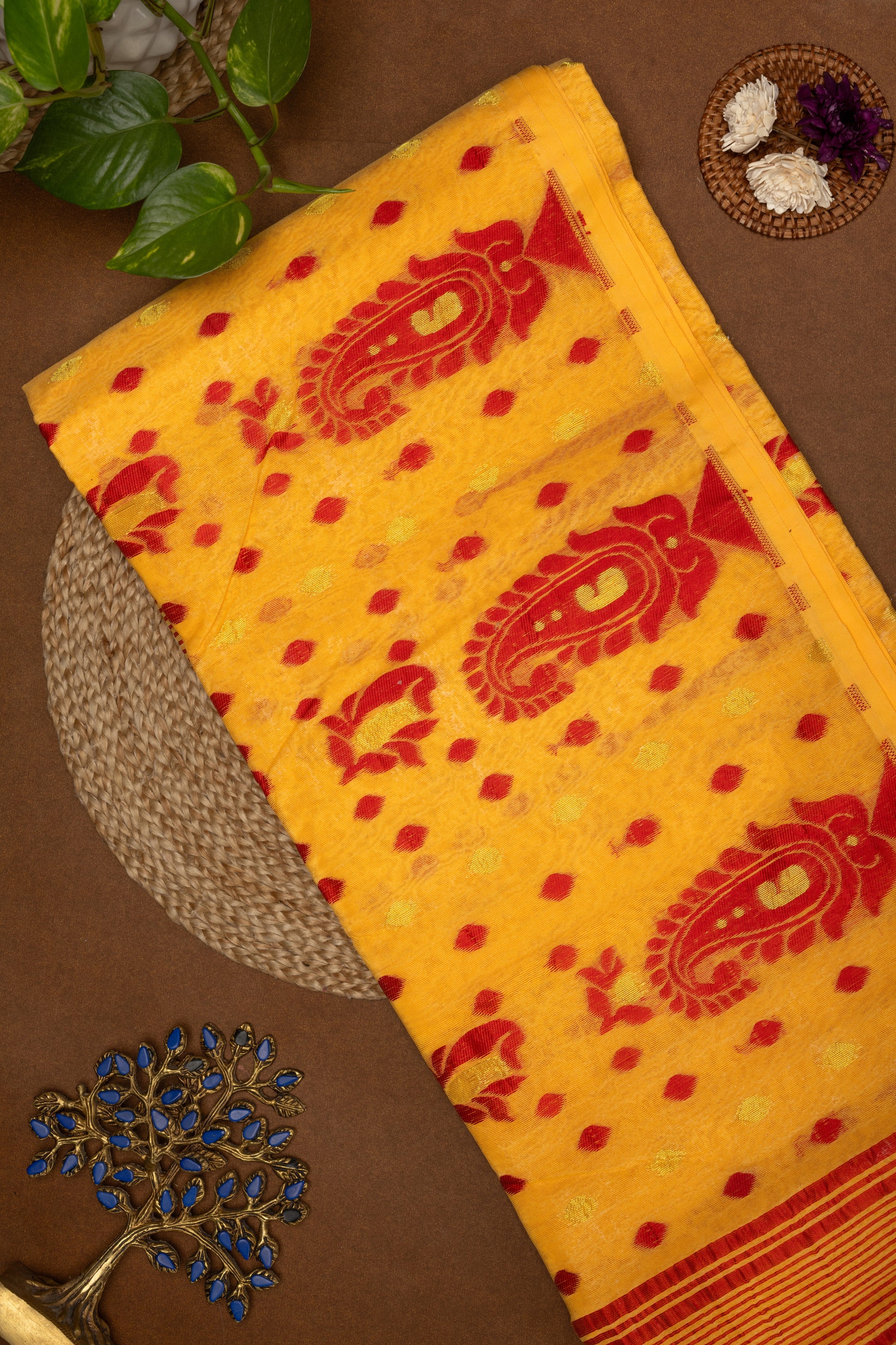 Bathed in the stunning glow of yellow , this Jamdani saree is a whisper of heritage woven into every thread. The fabric embodies purity and serenity, reminiscent of ivory sands under golden light. What makes this piece exceptional is its kolka & phool motif arrangement—a striking departure from the conventional grid of Jamdani, lending the drape a dynamic rhythm and sense of movement.