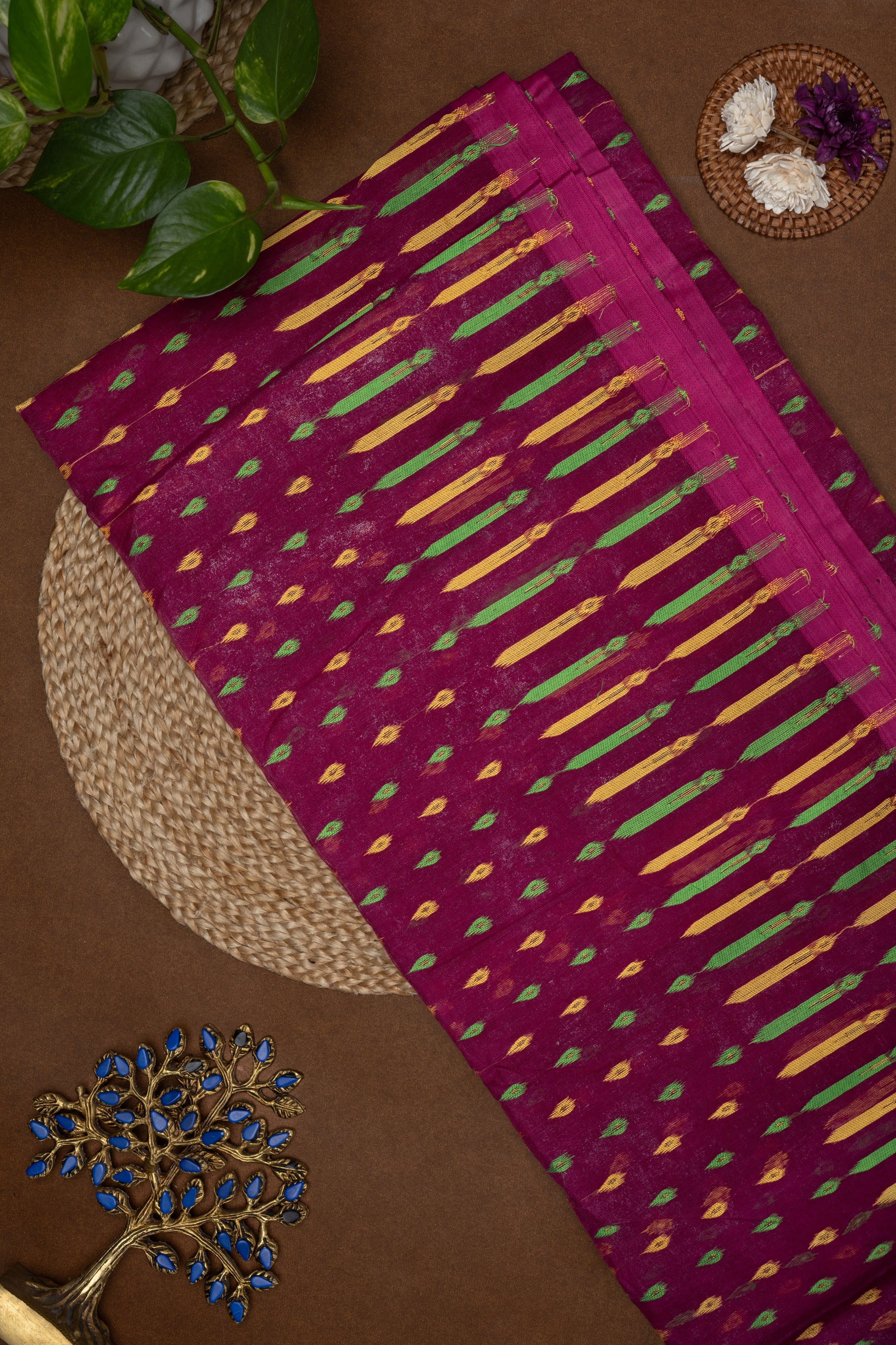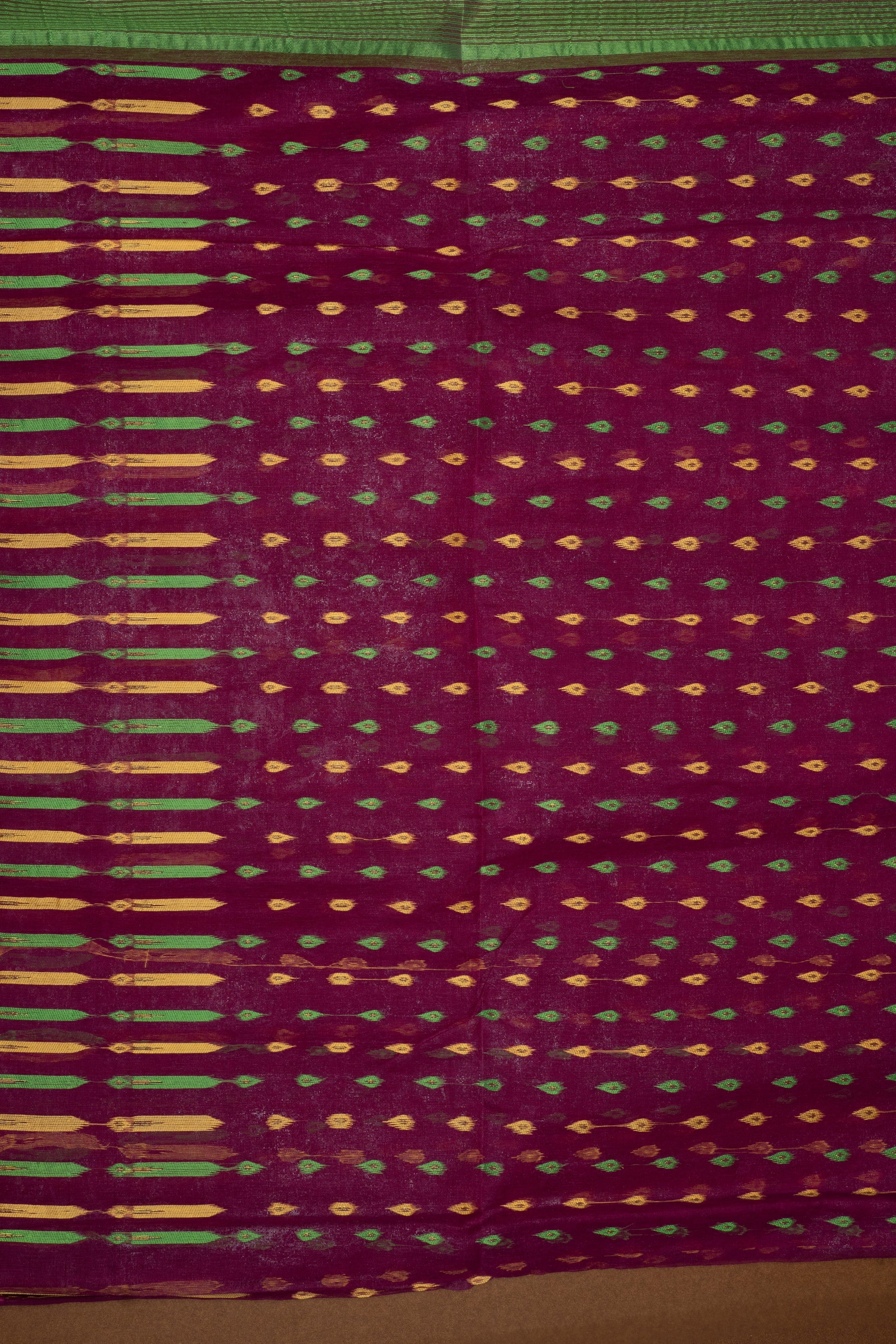 Bathed in the striking glow of magenta , this Jamdani saree is a whisper of heritage woven into every thread. The fabric embodies purity and serenity, reminiscent of ivory sands under golden light. What makes this piece exceptional is its hazar booti motif arrangement—a striking departure from the conventional grid of Jamdani, lending the drape a dynamic rhythm and sense of movement.