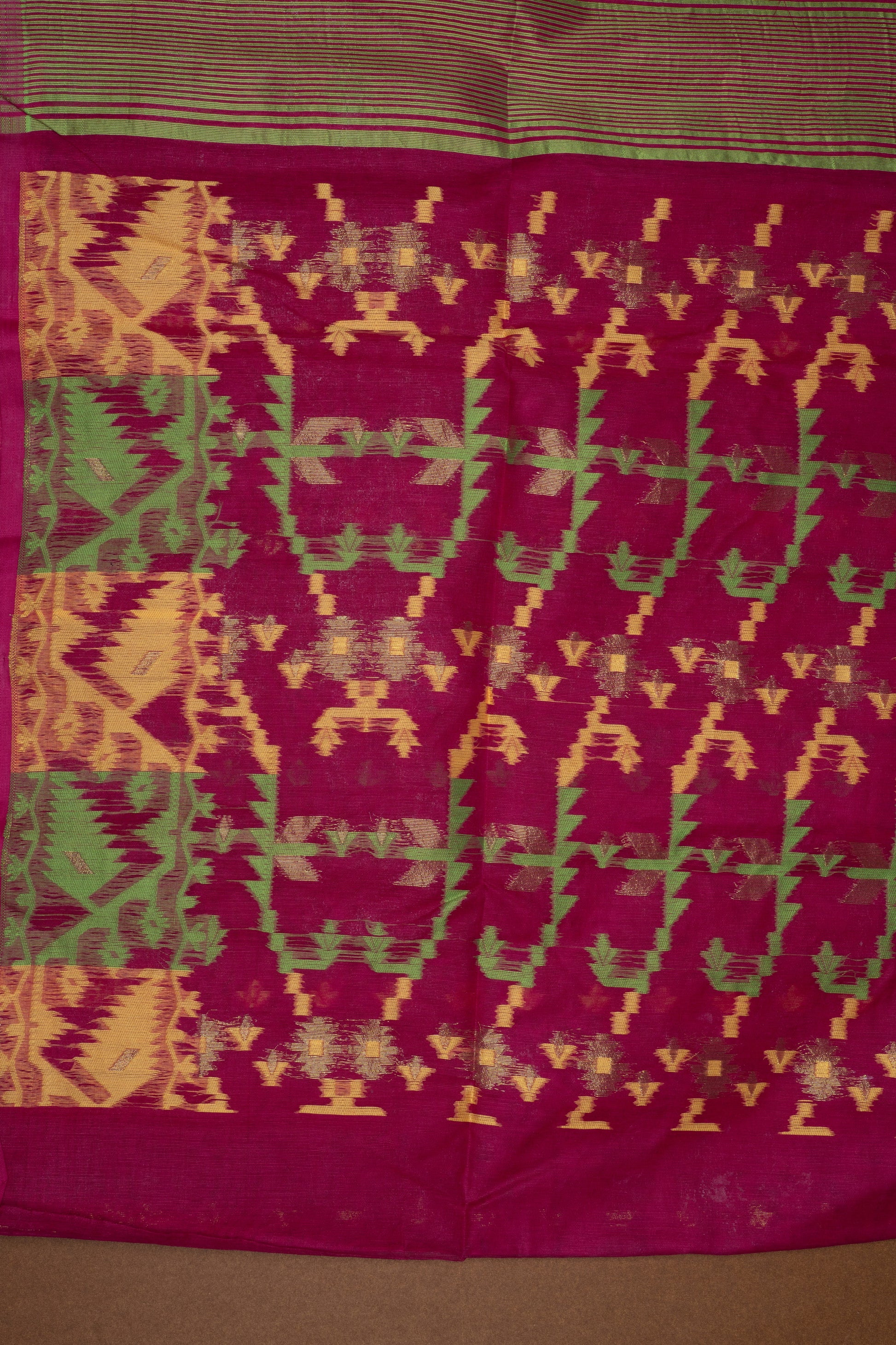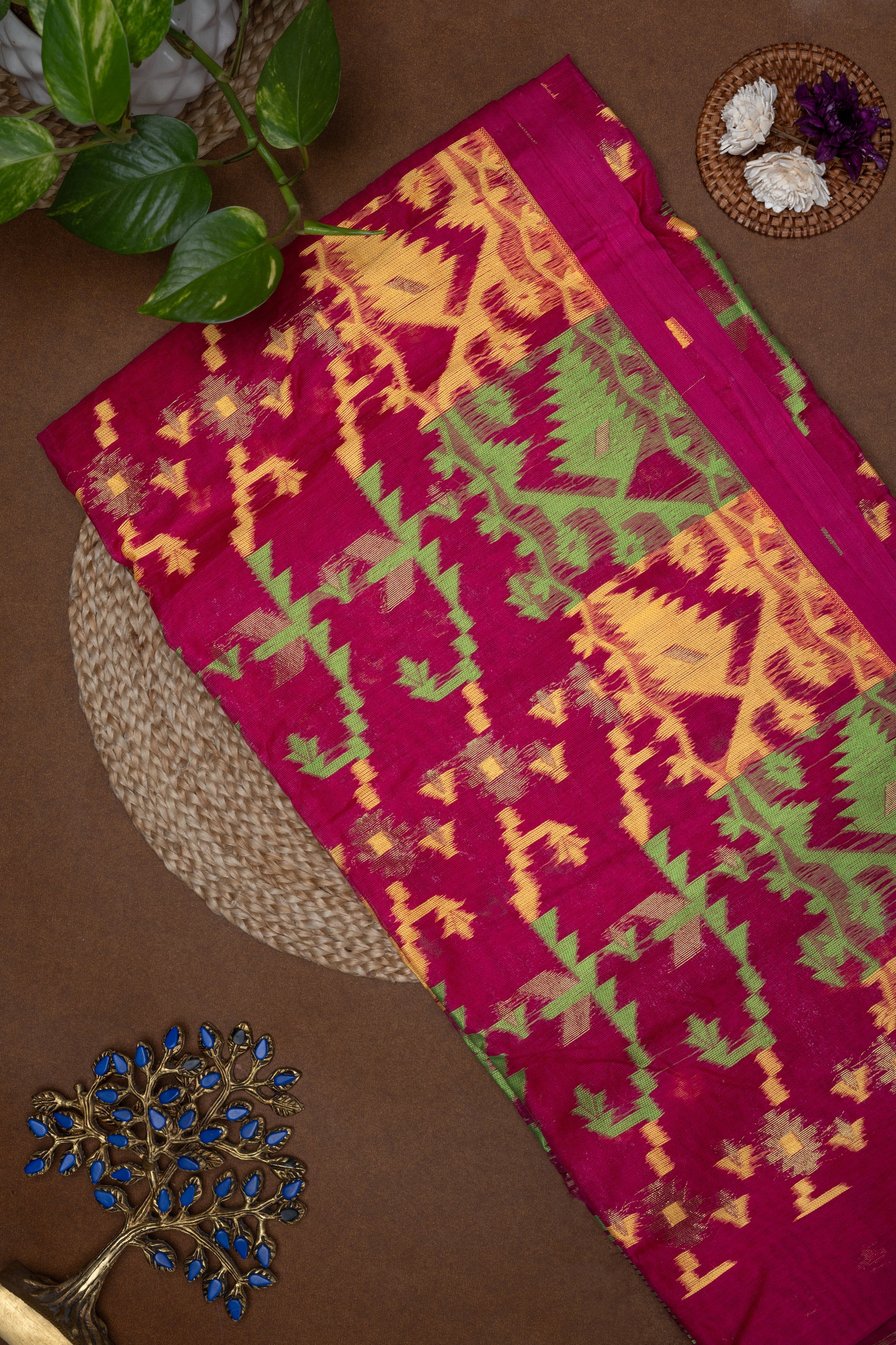 Bathed in the stunning glow of bright pink , this Jamdani saree is a whisper of heritage woven into every thread. The fabric embodies purity and serenity, reminiscent of ivory sands under golden light. What makes this piece exceptional is its diagonal motif arrangement—a striking departure from the conventional grid of Jamdani, lending the drape a dynamic rhythm and sense of movement.