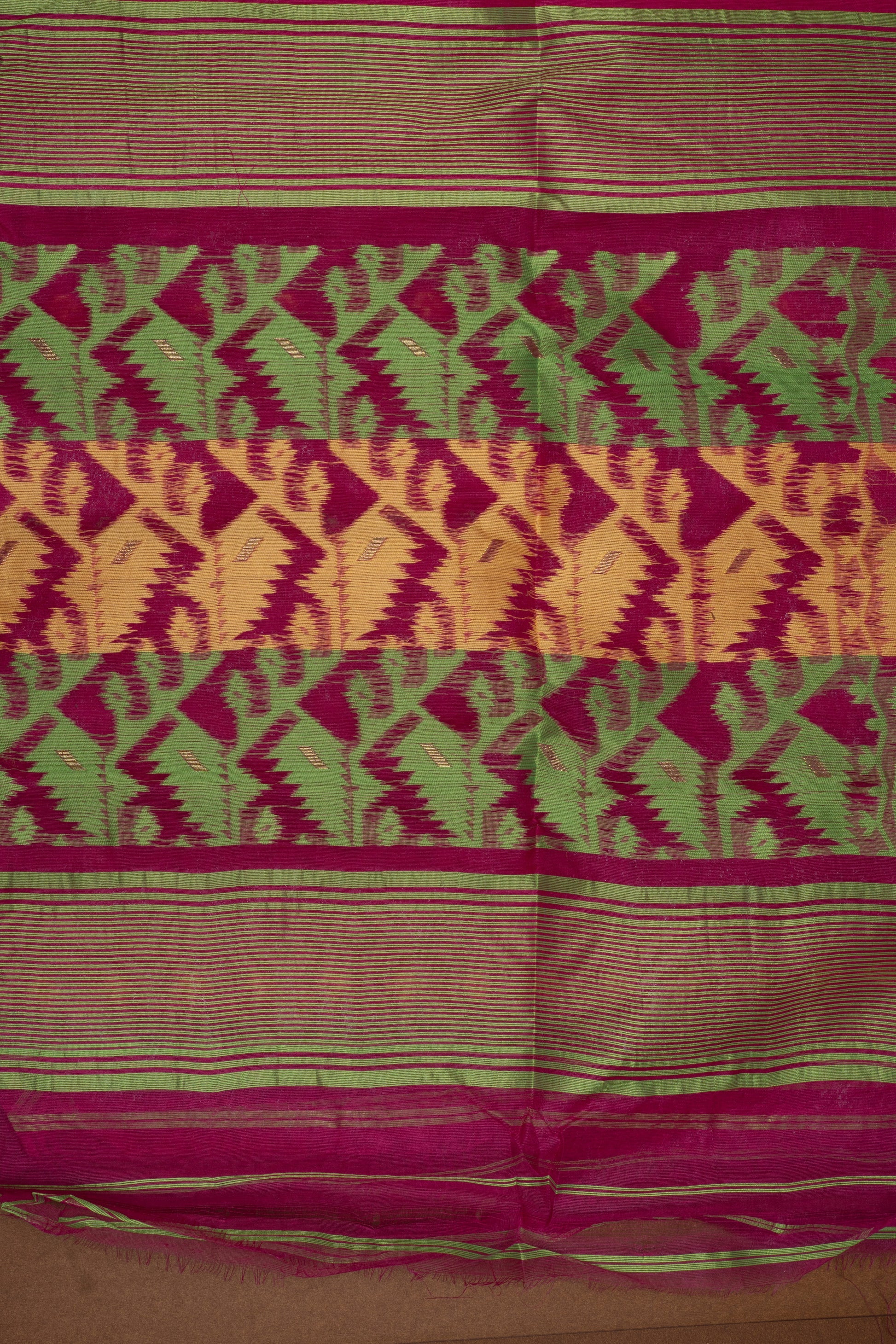very motif is the result of supplementary weft weaving, where artisans interlace threads with the base yarn, without any mechanical aid. It is said that a single Jamdani saree can take anywhere from 120 to 200 hours, depending on intricacy, and this diagonal composition demands even greater precision.