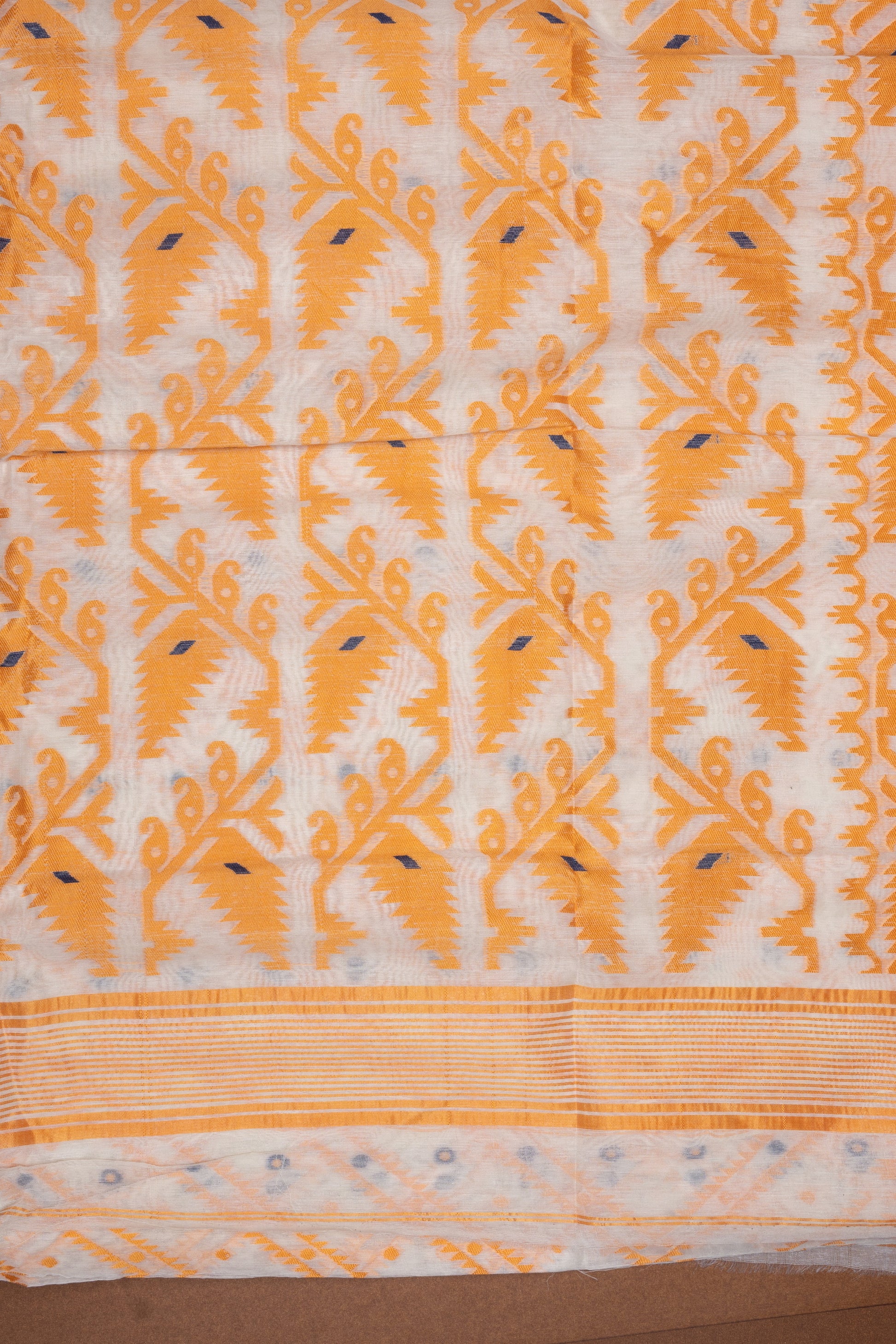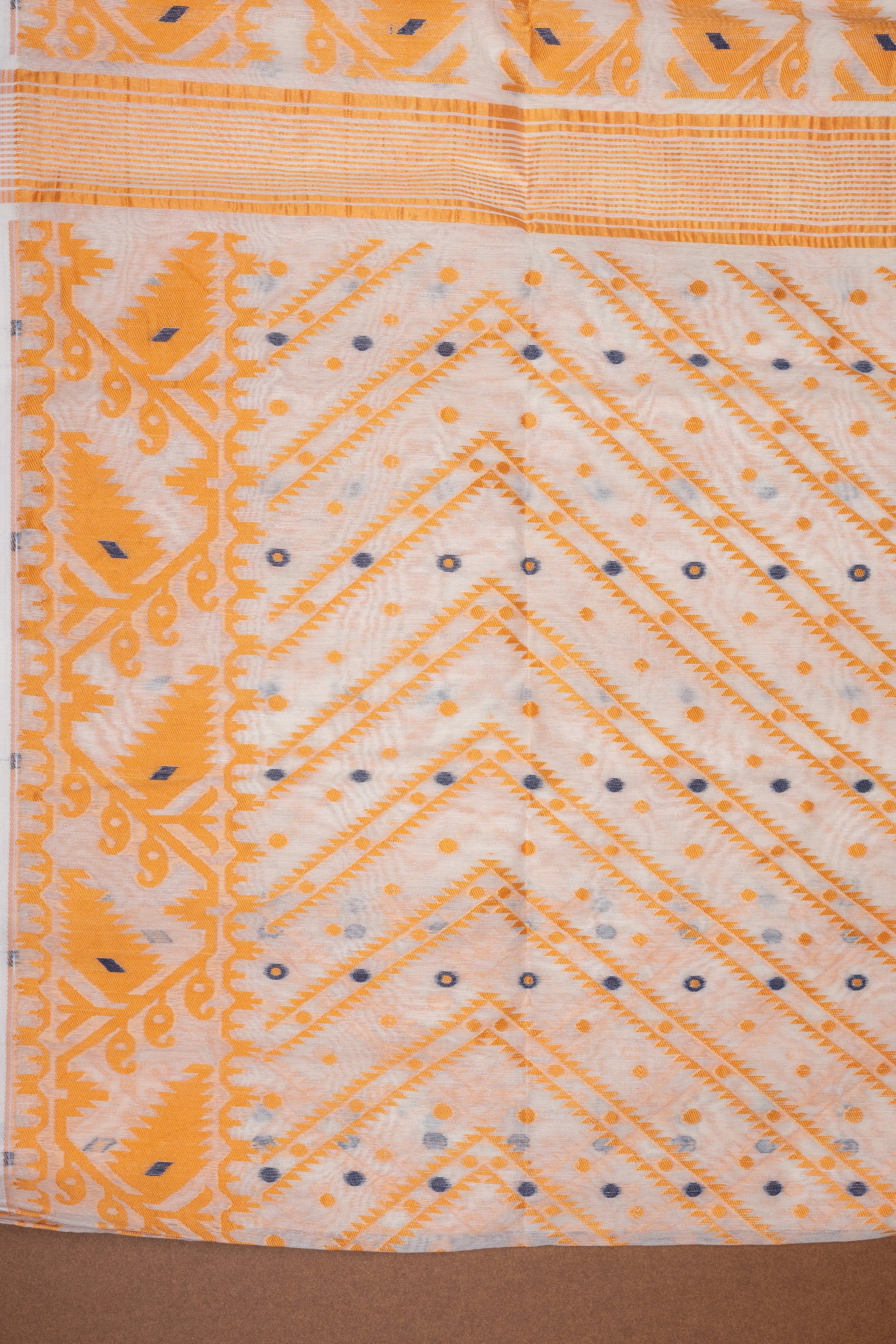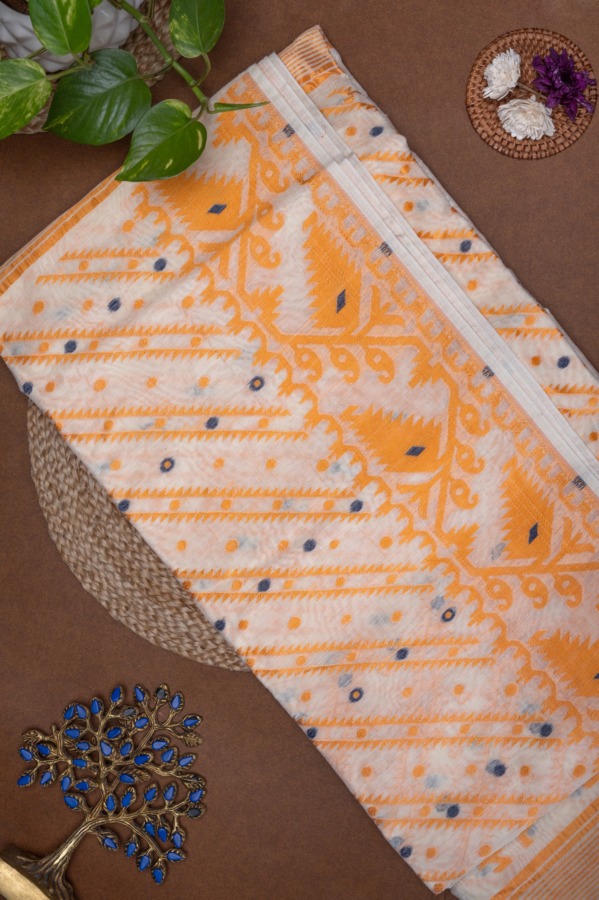 Bathed in the subtle glow of cream, this Jamdani saree is a whisper of heritage woven into every thread. The fabric embodies purity and serenity, reminiscent of ivory sands under golden light. What makes this piece exceptional is its diagonal motif arrangement—a striking departure from the conventional grid of Jamdani, lending the drape a dynamic rhythm and sense of movement.