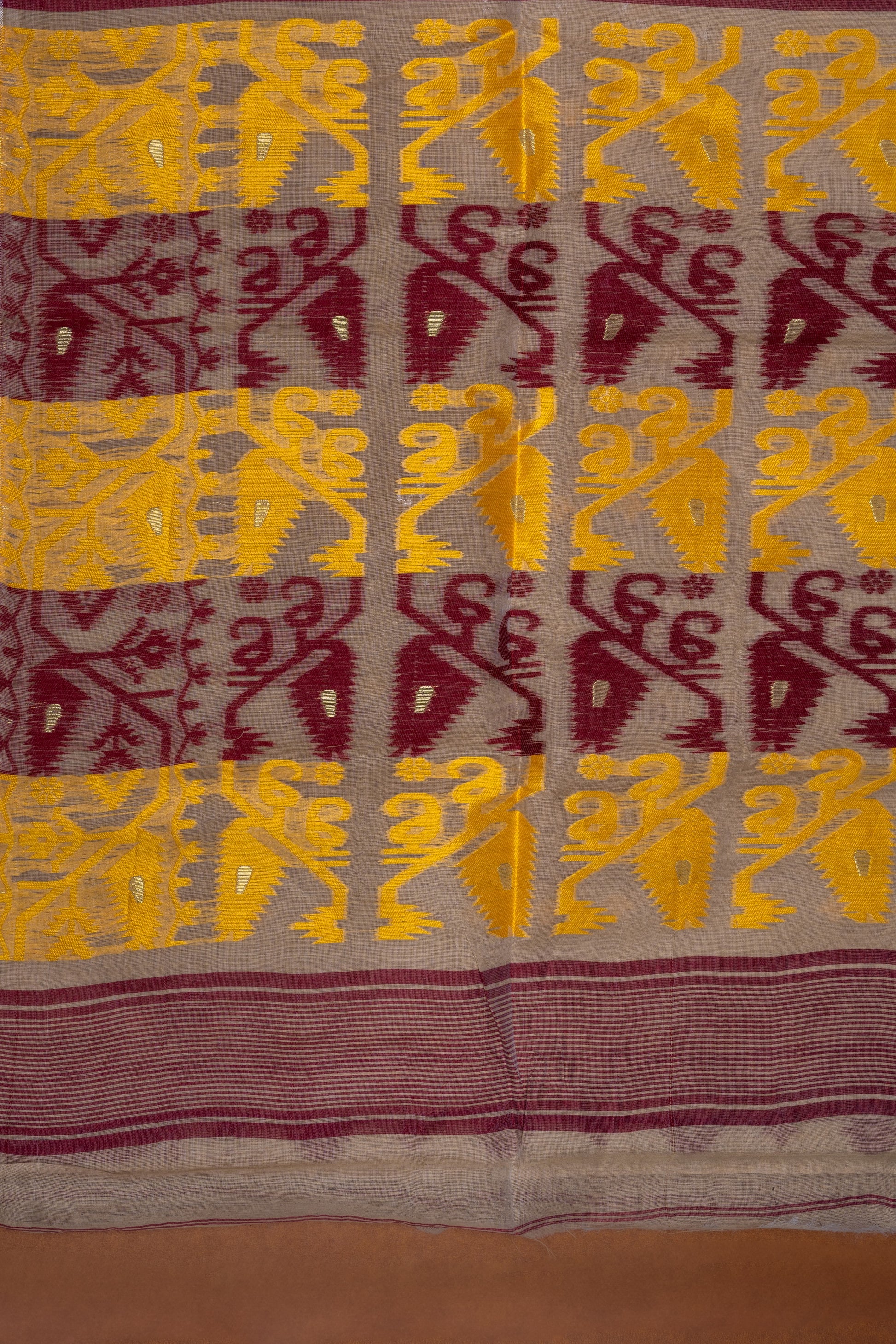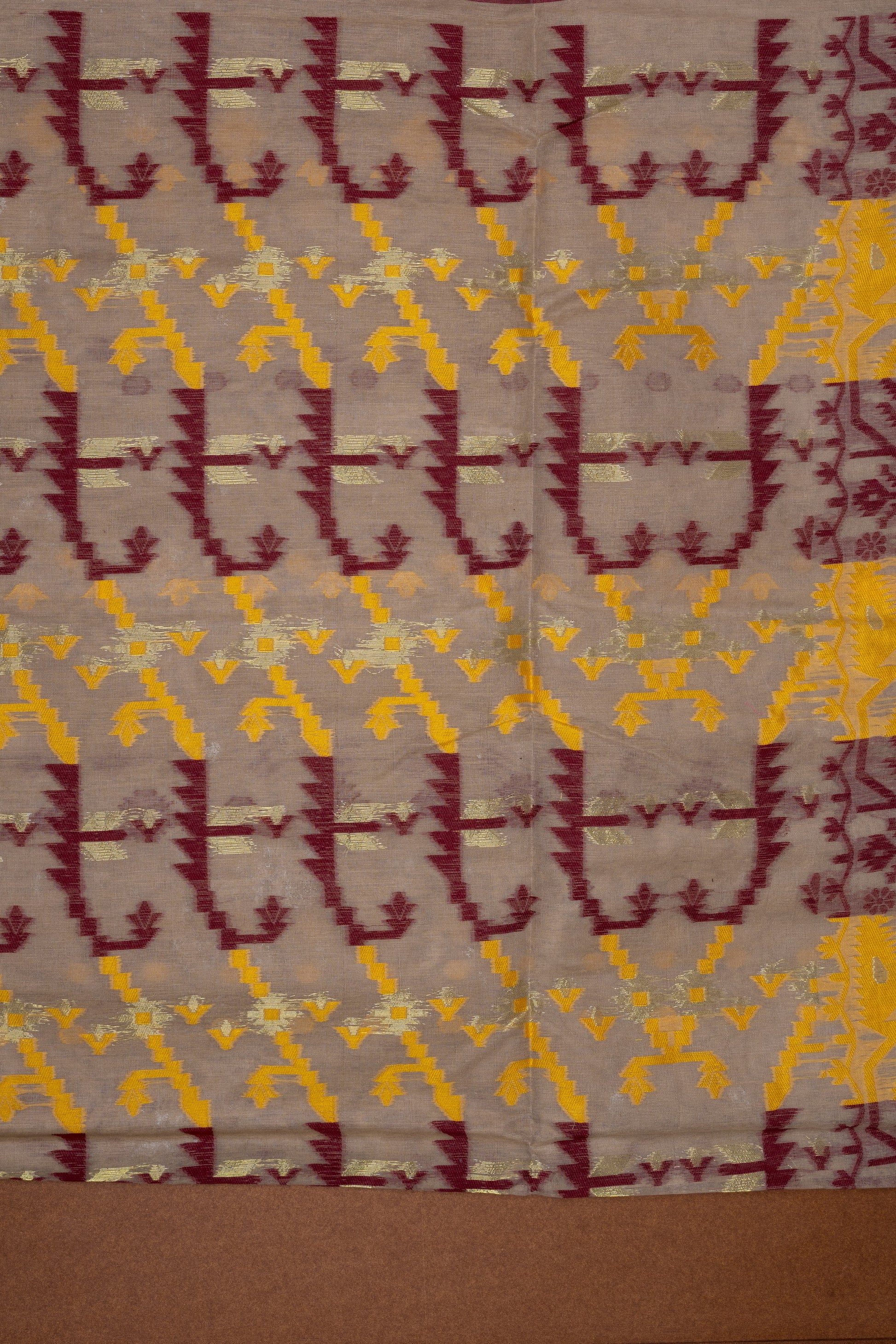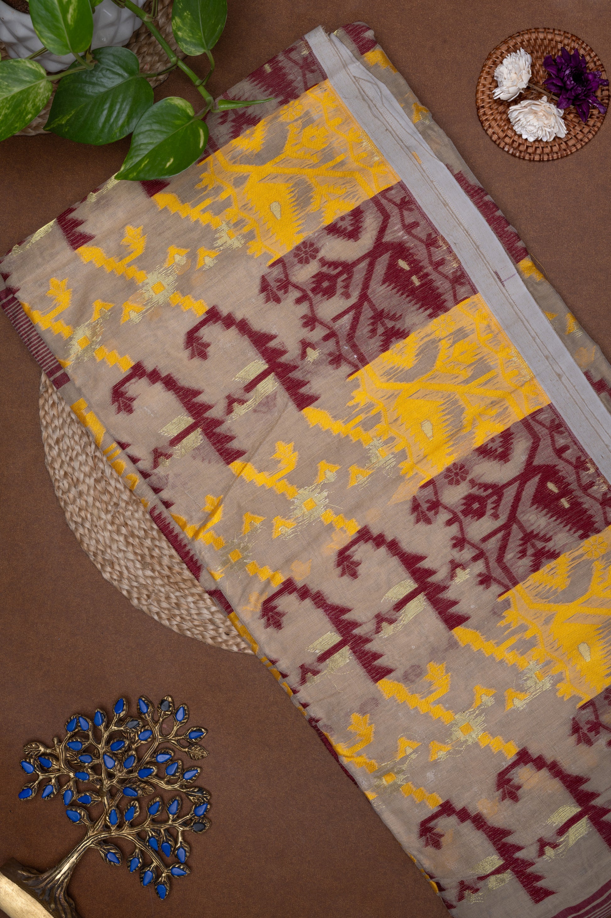 Bathed in the subtle glow of an earthy tone, this Jamdani saree is a whisper of heritage woven into every thread. The fabric embodies purity and serenity, reminiscent of ivory sands under golden light. What makes this piece exceptional is its diagonal motif arrangement—a striking departure from the conventional grid of Jamdani, lending the drape a dynamic rhythm and sense of movement.