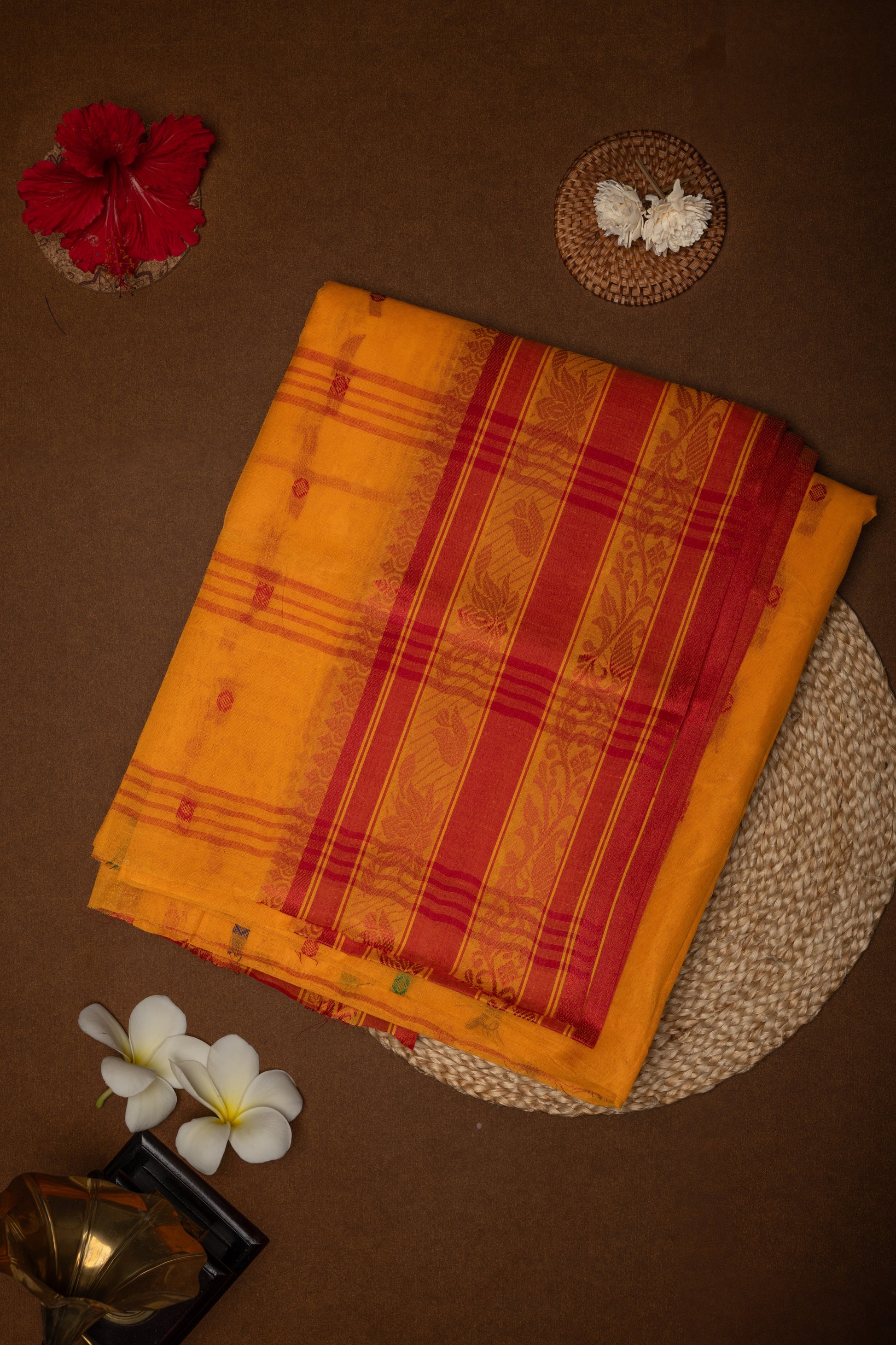 Experience the timeless elegance of the Tangail Tant saree, handwoven to perfection with the finest cotton for unmatched comfort and breathability. This classic saree features exquisite ornate floral and paisley borders, intricately crafted by skilled artisans using traditional handloom techniques passed down through generations.