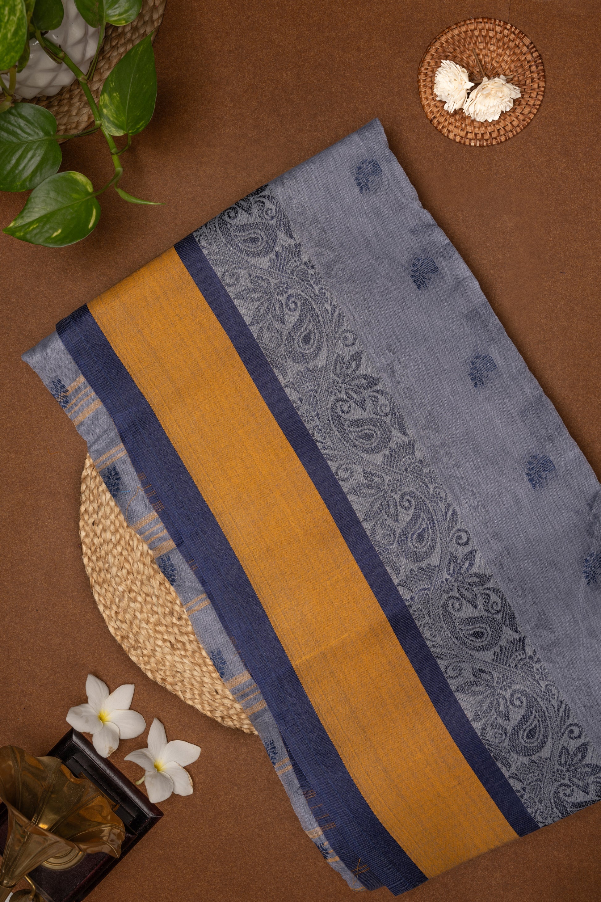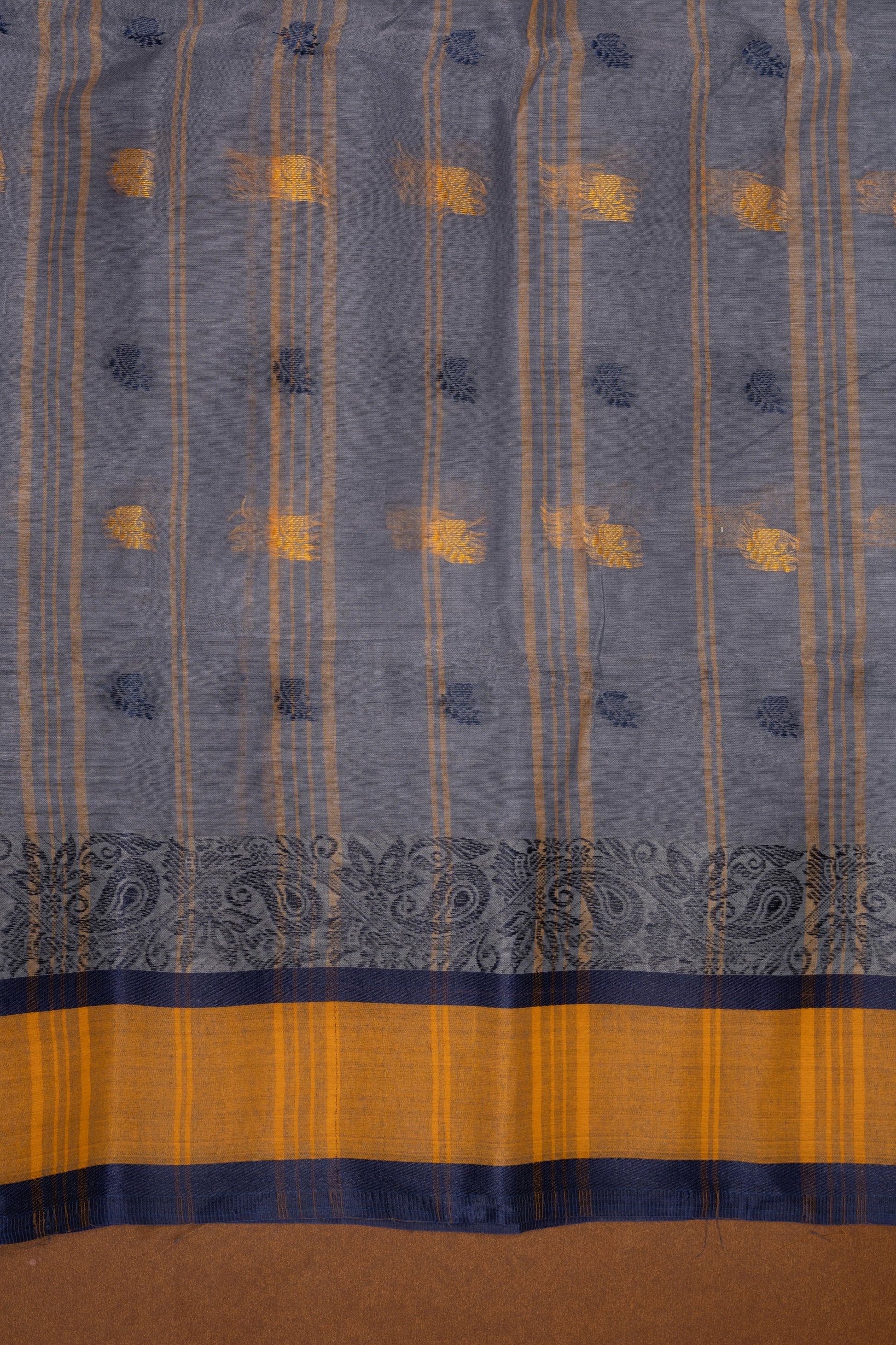 Chaayabrita - Grey Bengal Cotton Saree with Navy Blue & Mustard Floral Border