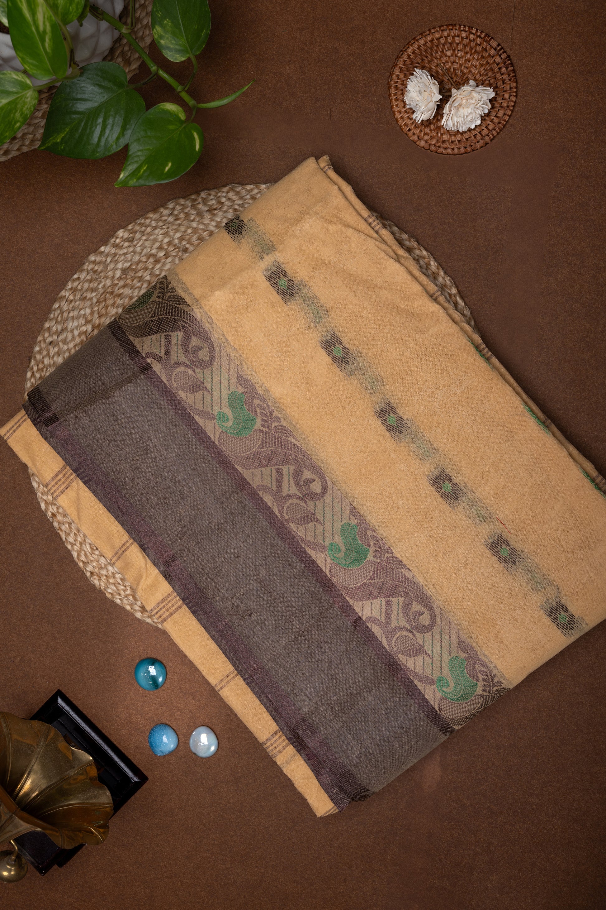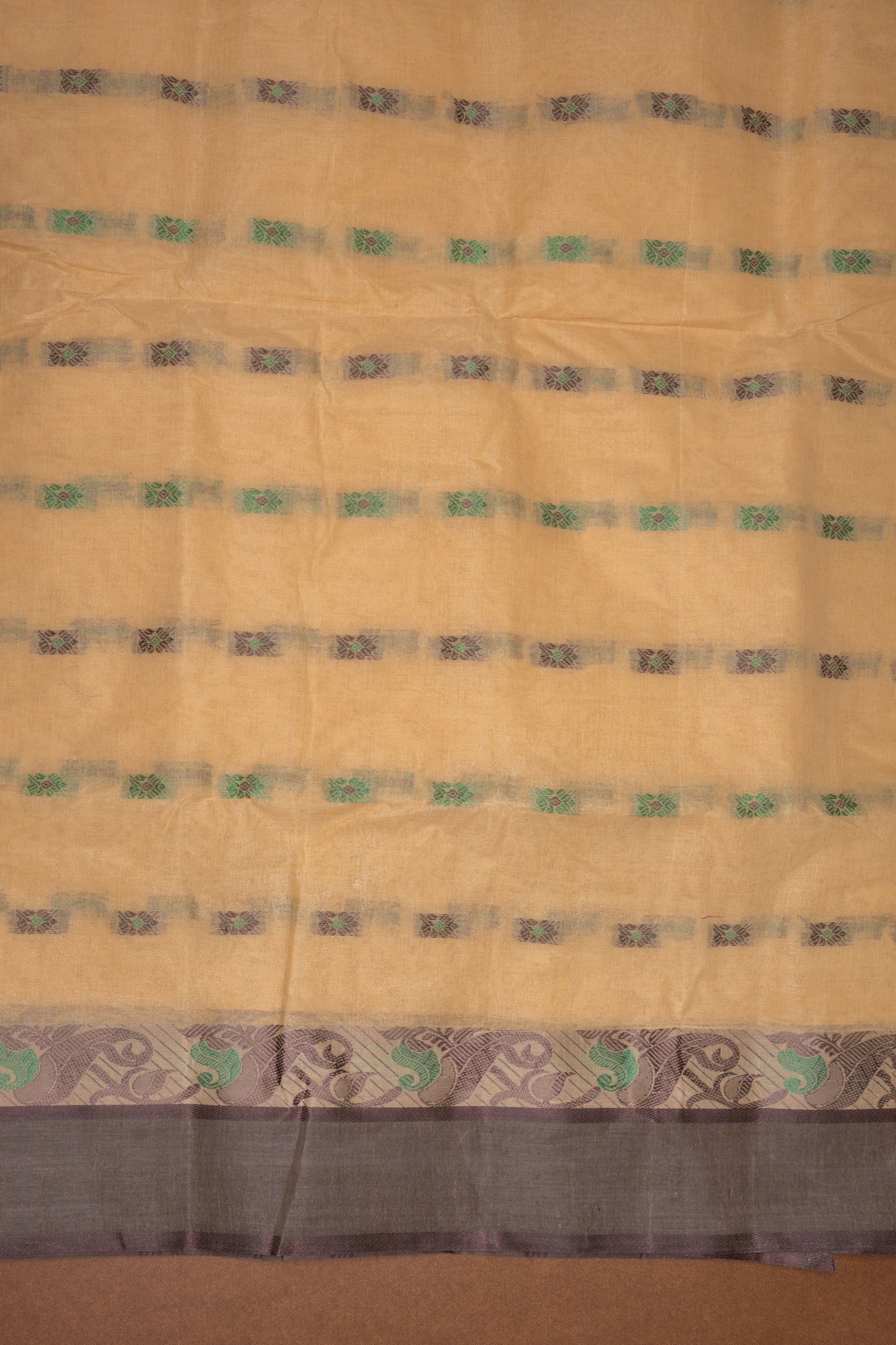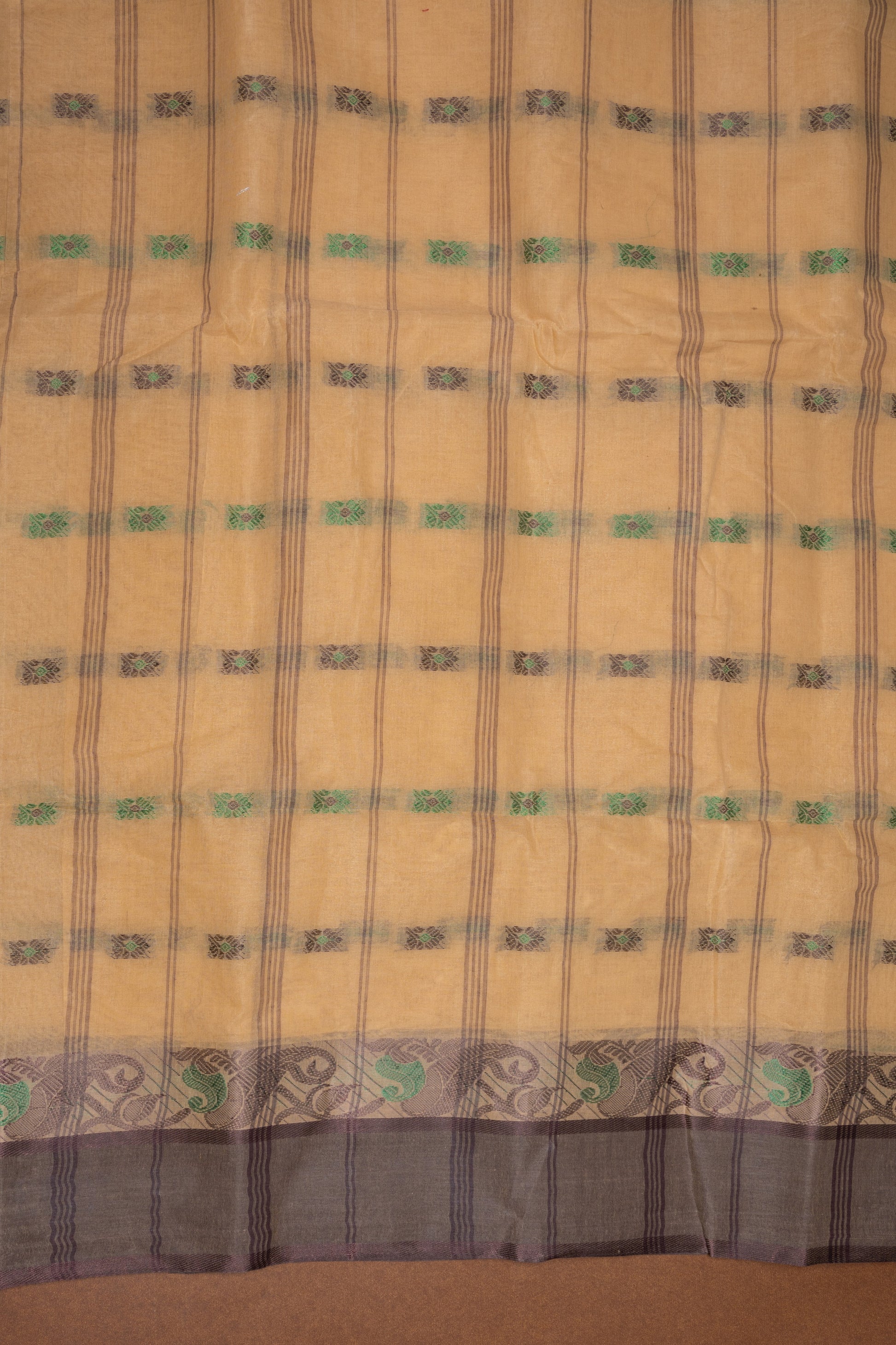 Komolodhuli - Sand Beige Bengal Cotton Saree with Olive Green and Coffee Brown floral Border