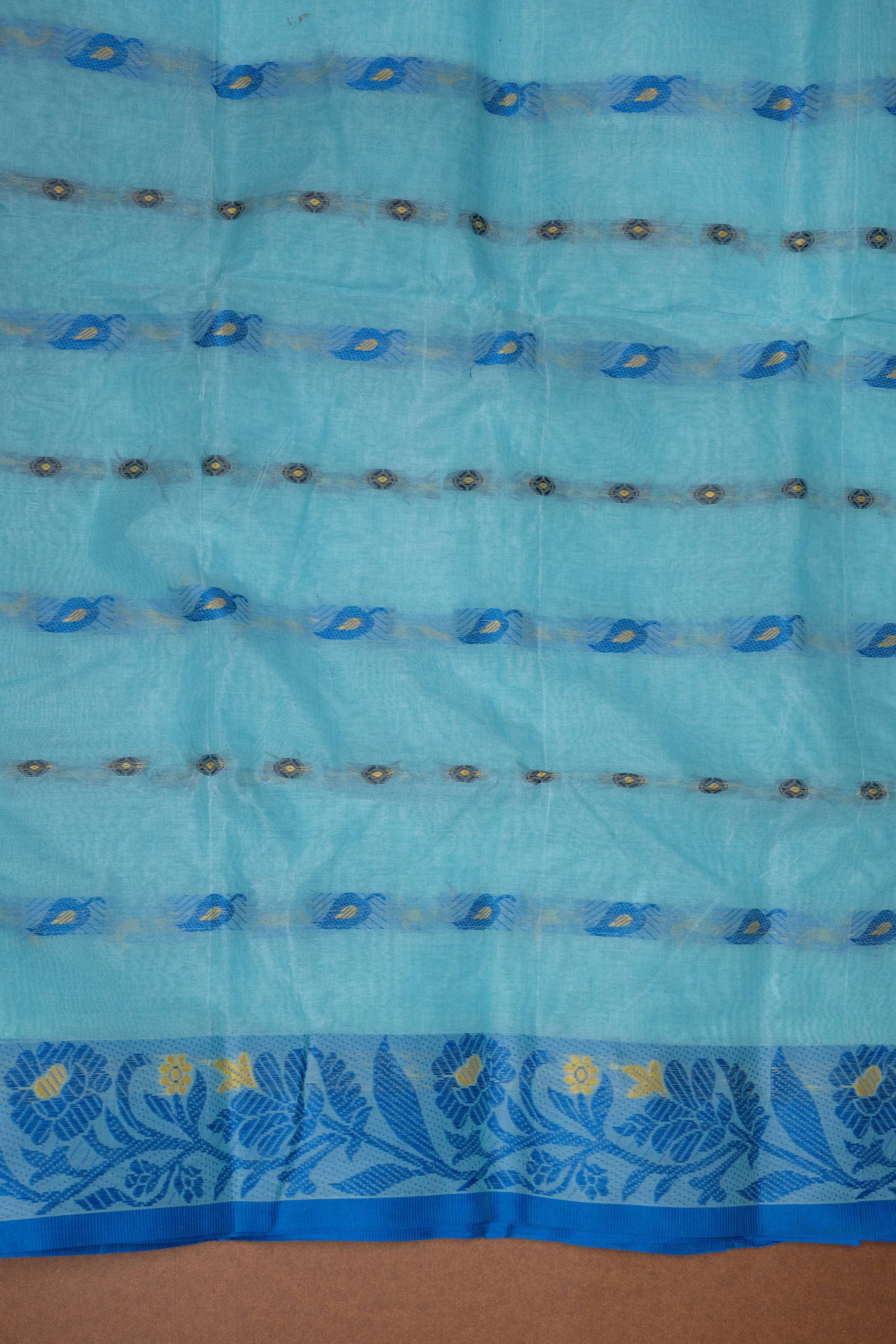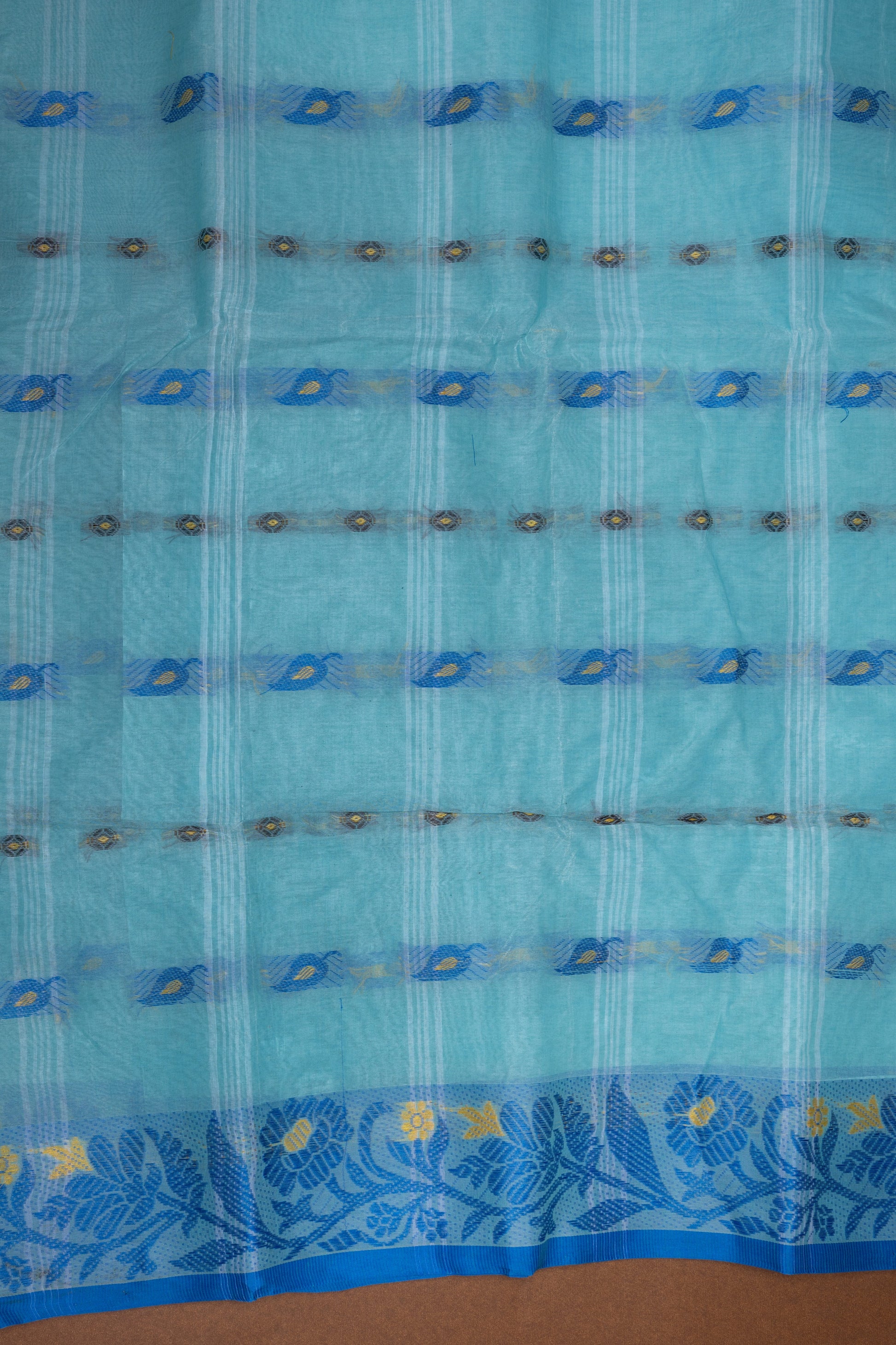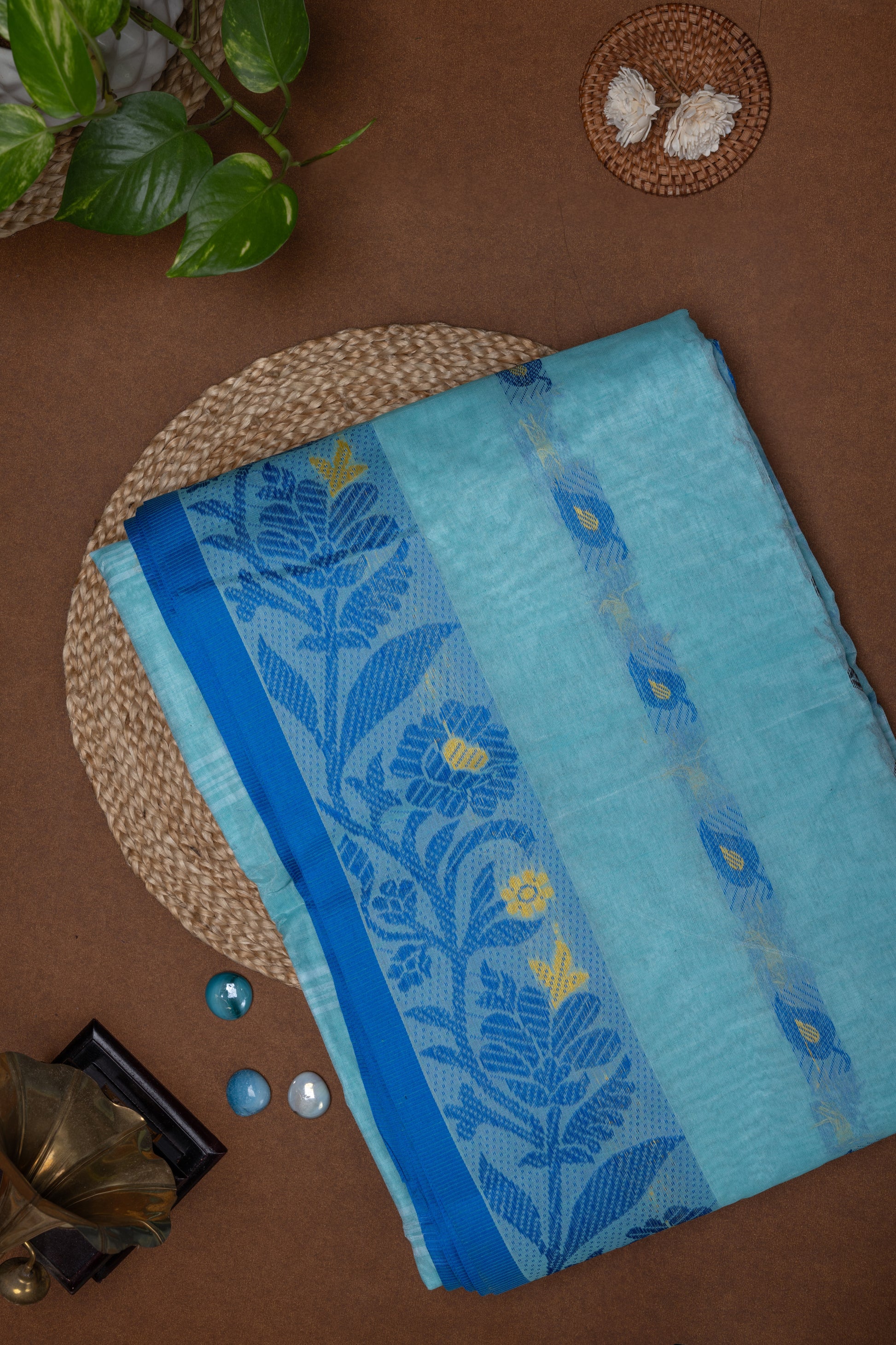 Akashlata - Aqua Blue Bengal Cotton Saree with Royal Blue and Yellow Floral Border
