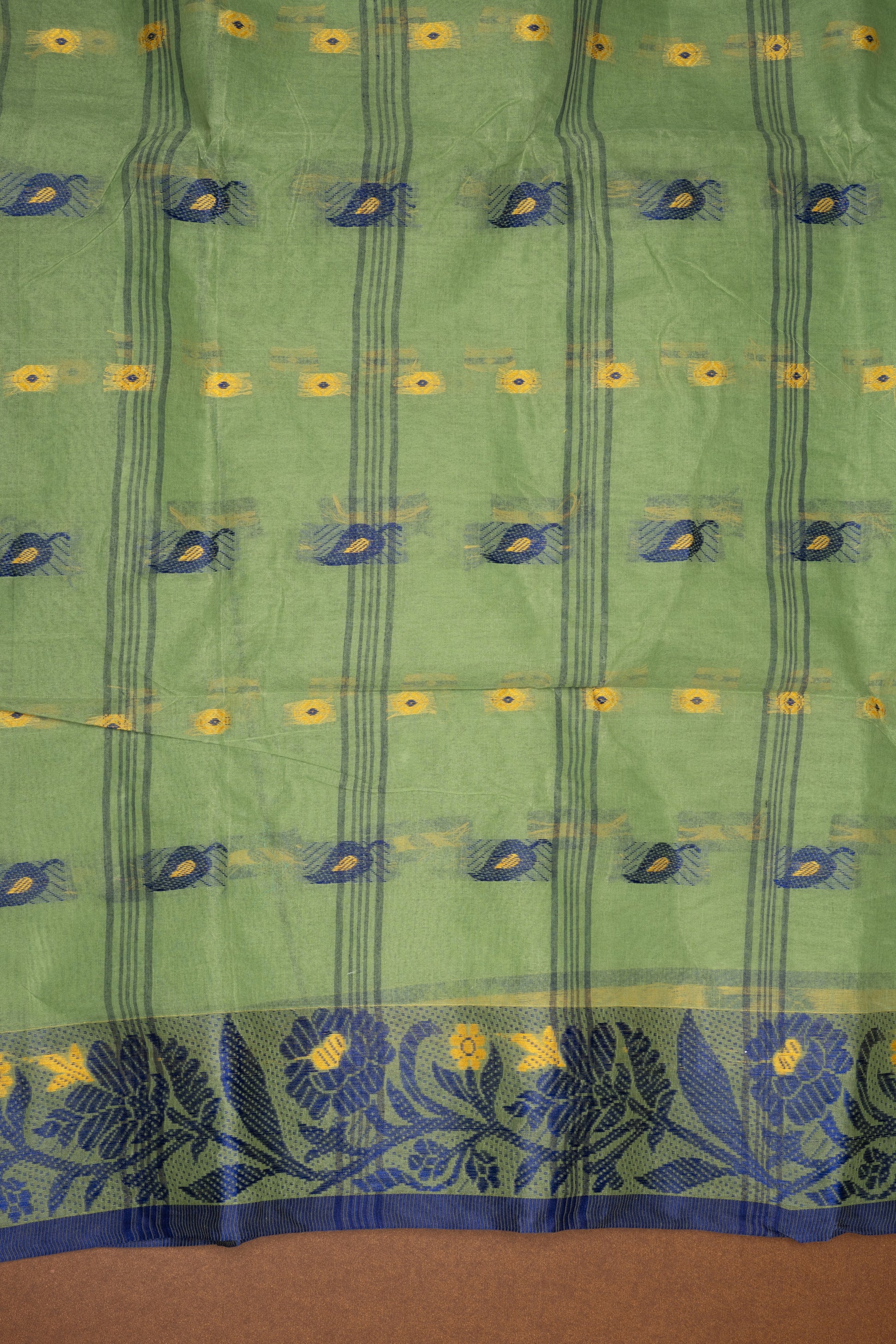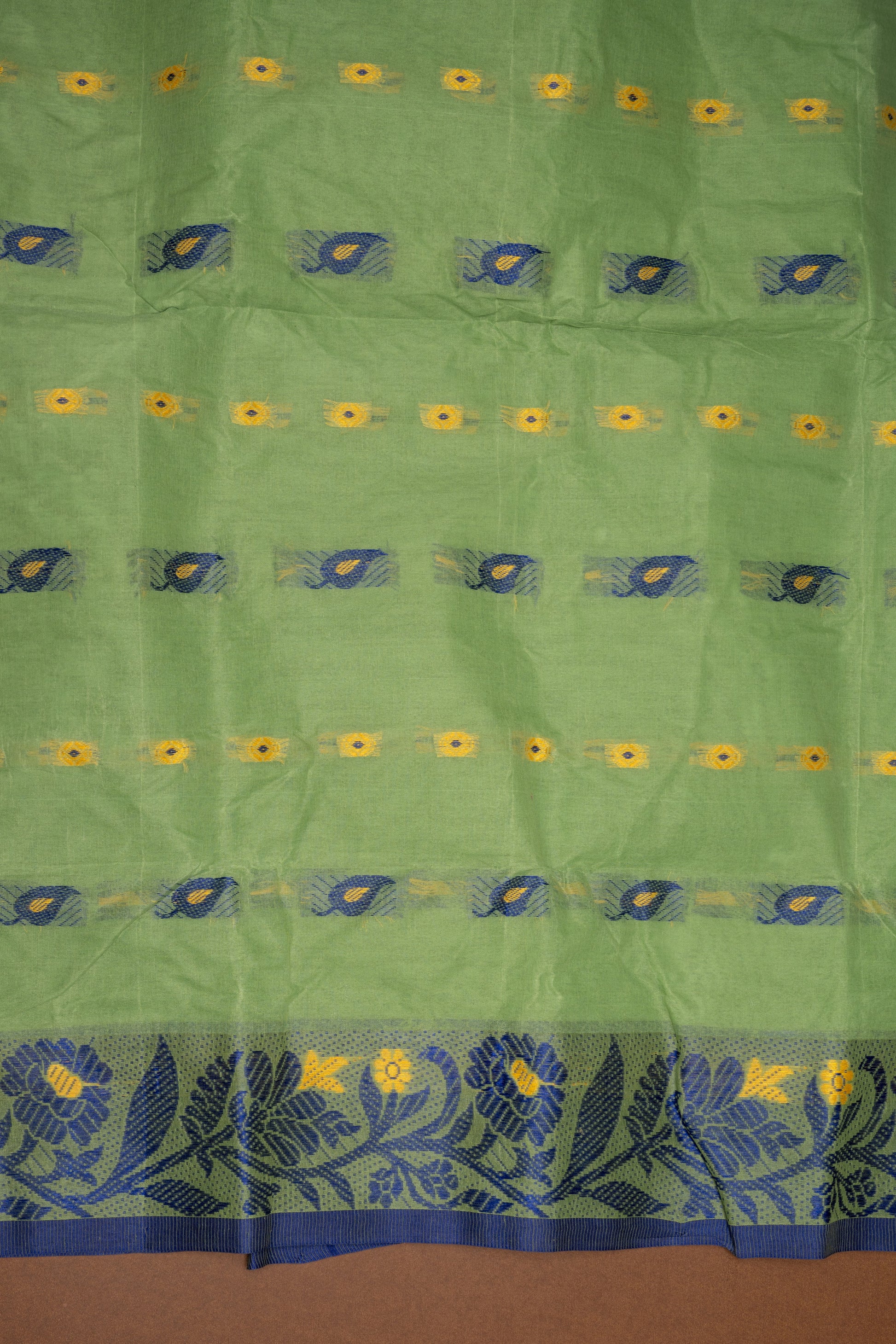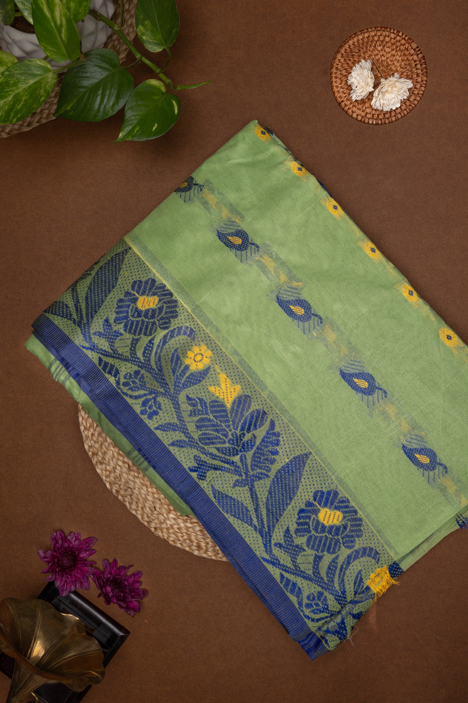 Pallavi - Pista Green Bengal Cotton Saree with Navy Blue Floral Border
