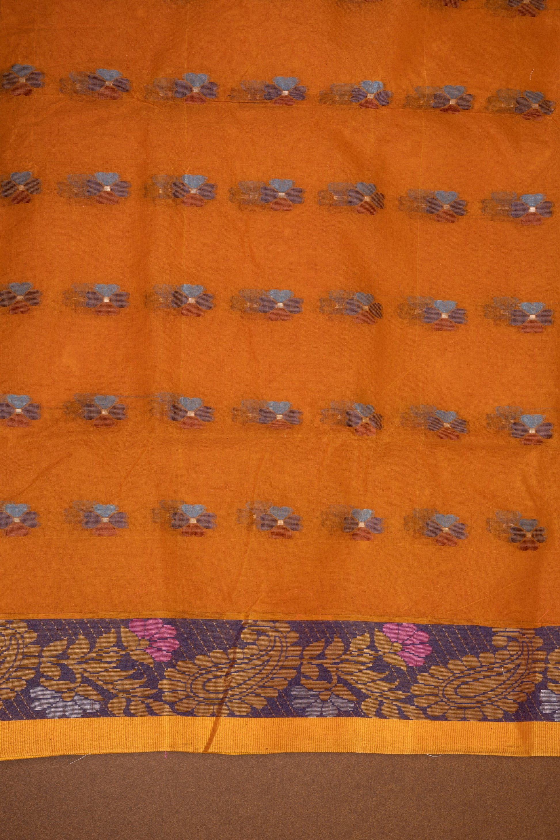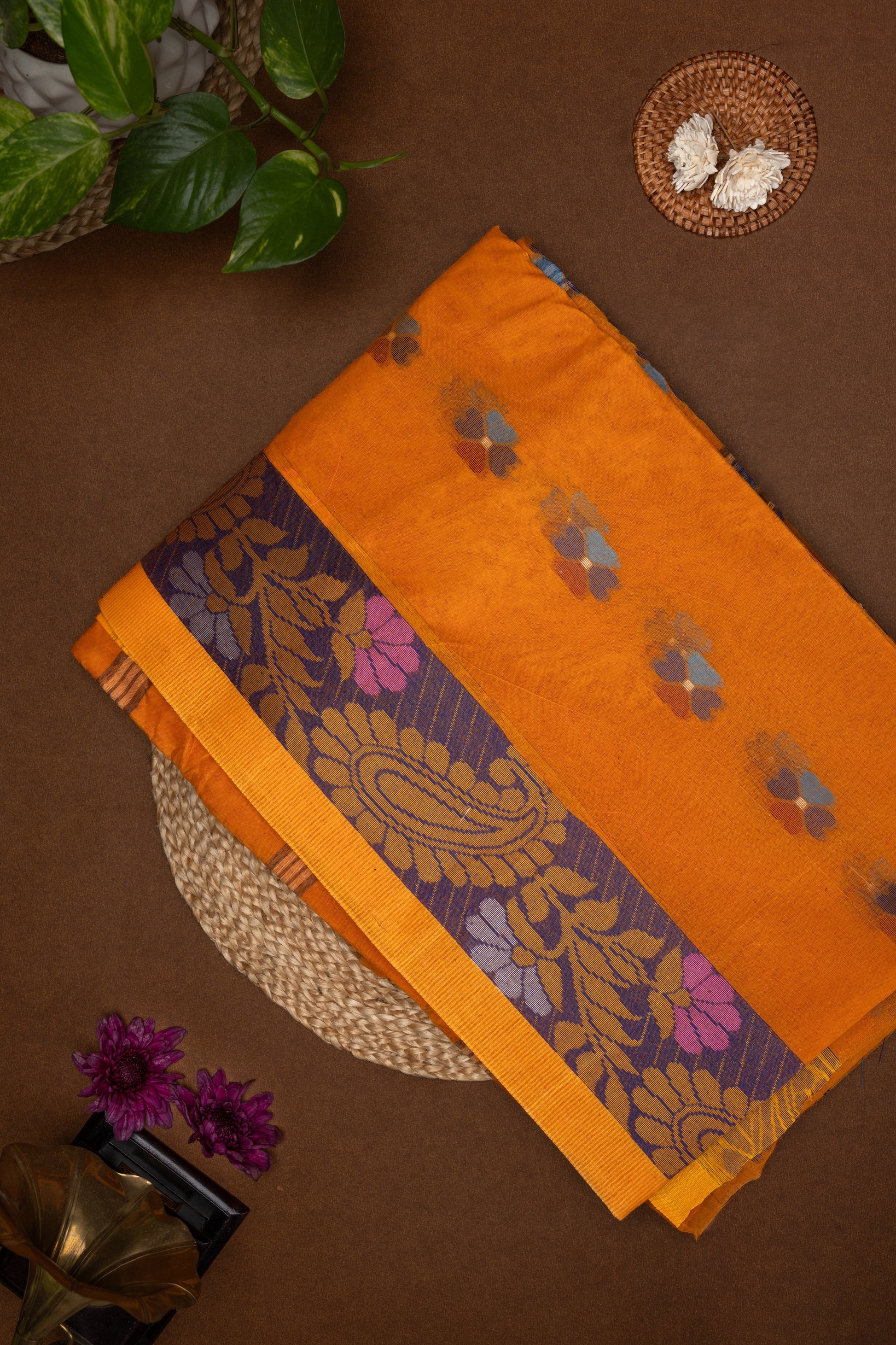 Amrapaali – Marigold Yellow Bengal Cotton Saree with Royal Purple Floral Border