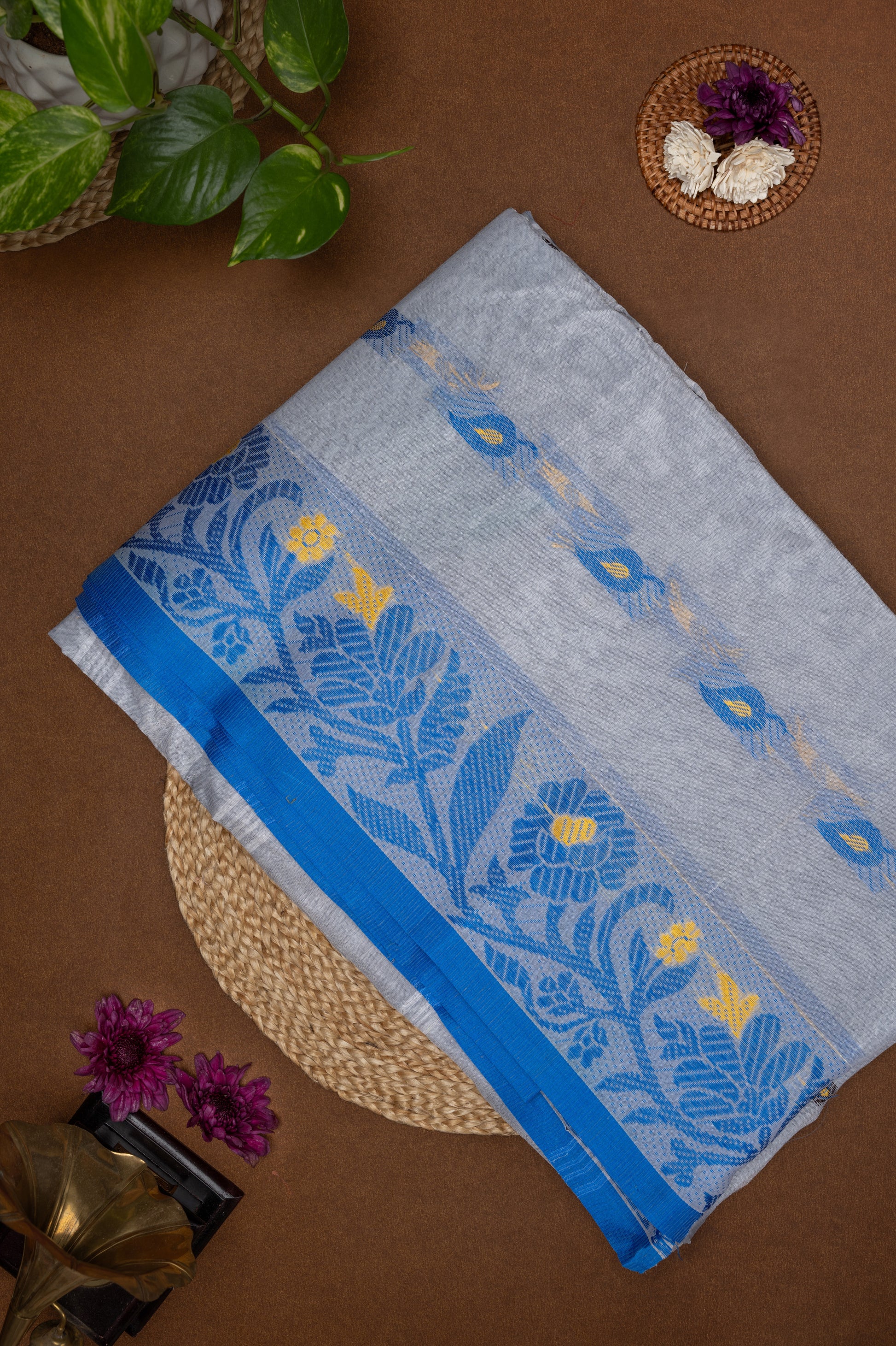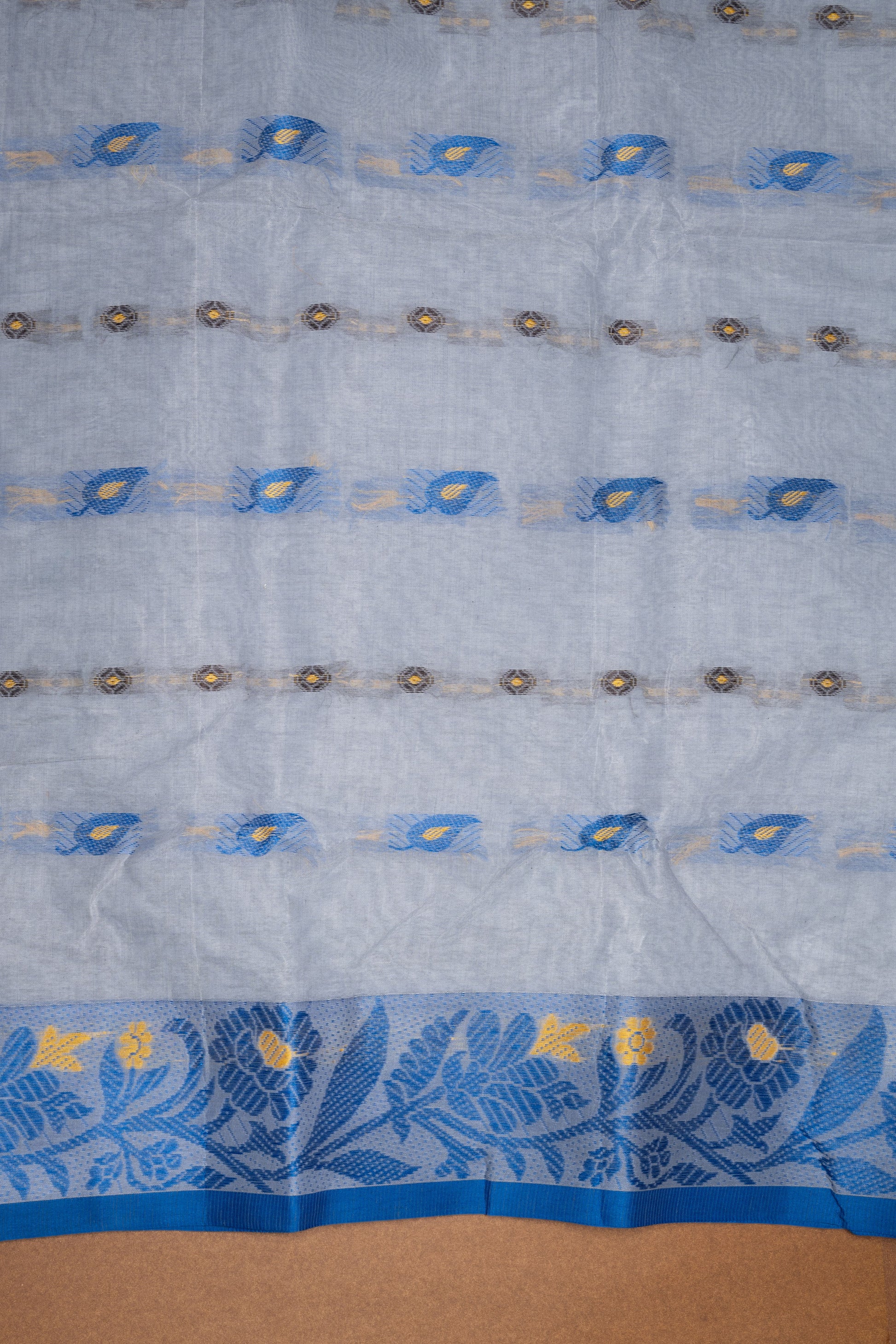 Indira - Light Grey Bengal Cotton Saree with Blue floral border