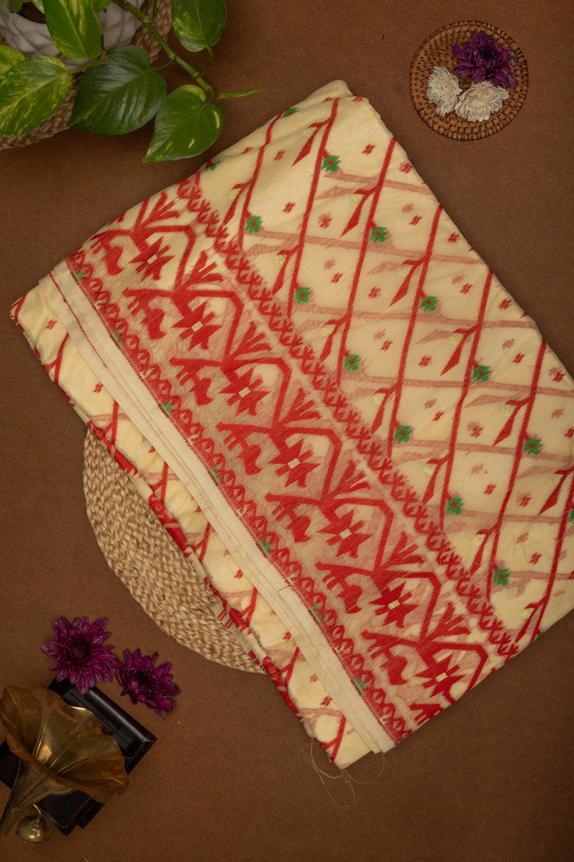 The body of the Jamdani celebrates minimalism with sophistication, while the borders and pallu carry whispers of ornamentation—motifs that echo nature’s inspirations: delicate vines, stylized florals, and geometric accents. Together, they evoke both the refinement of Mughal-era artistry and the modern grace of timeless fashion.