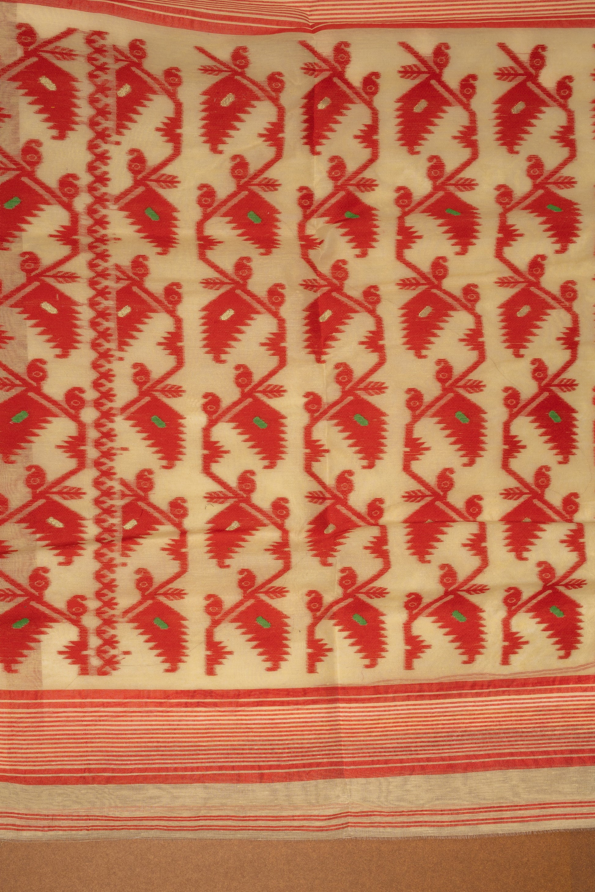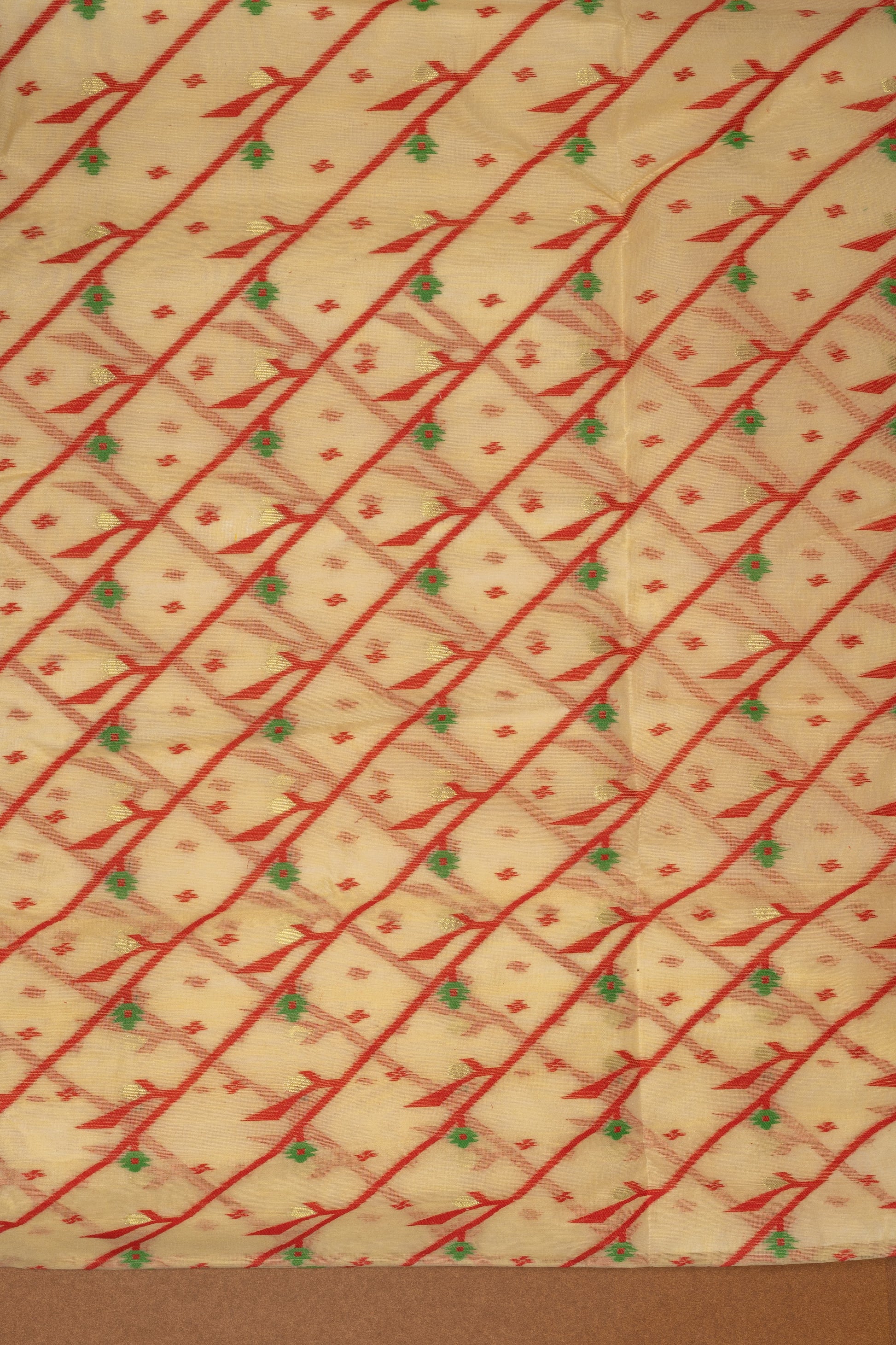 very motif is the result of supplementary weft weaving, where artisans interlace threads with the base yarn, without any mechanical aid. It is said that a single Jamdani saree can take anywhere from 120 to 200 hours, depending on intricacy, and this diagonal composition demands even greater precision.