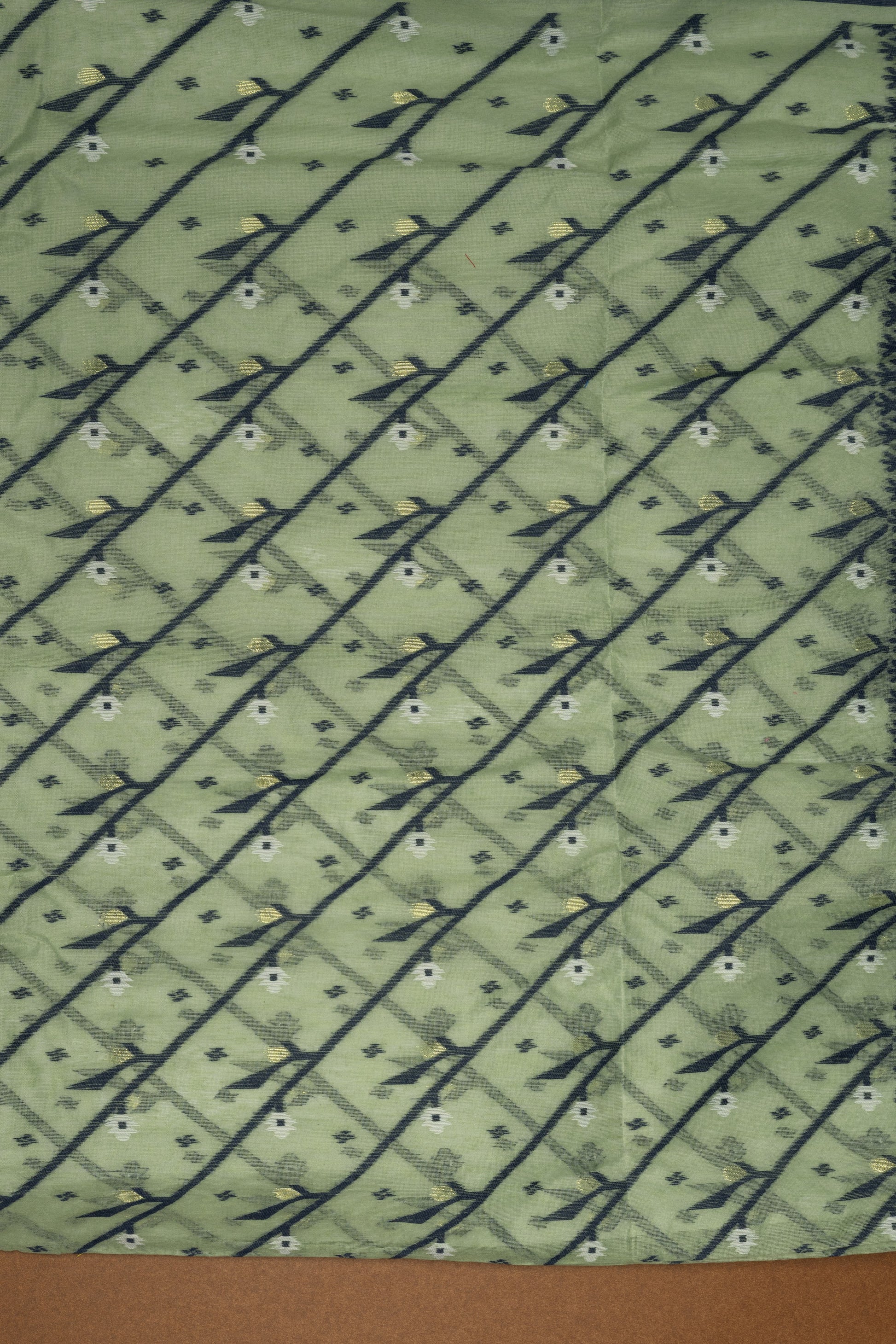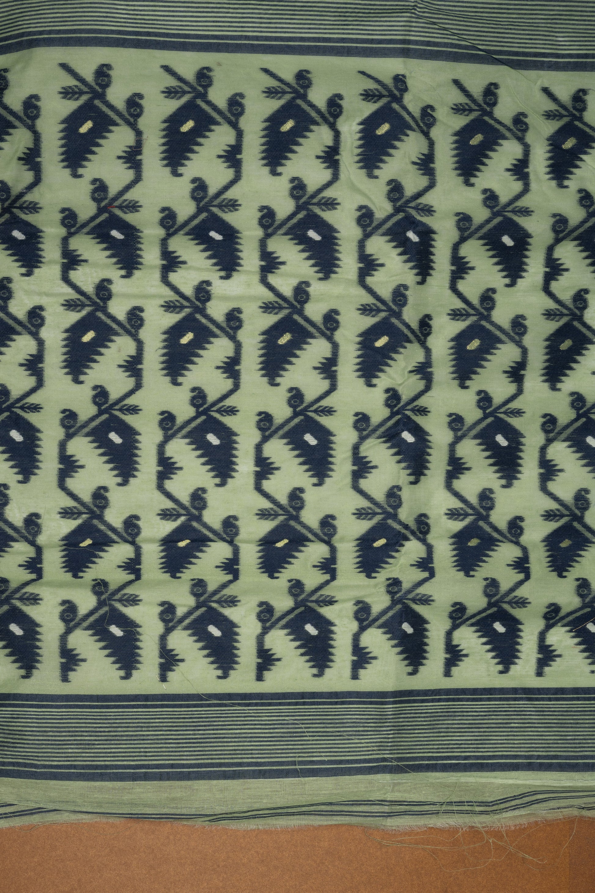 Bathed in the subtle glow of leafy green , this Jamdani saree is a whisper of heritage woven into every thread. The fabric embodies purity and serenity, reminiscent of ivory sands under golden light. What makes this piece exceptional is its meenakaari tulip diagonal motif arrangement—a striking departure from the conventional grid of Jamdani, lending the drape a dynamic rhythm and sense of movement.