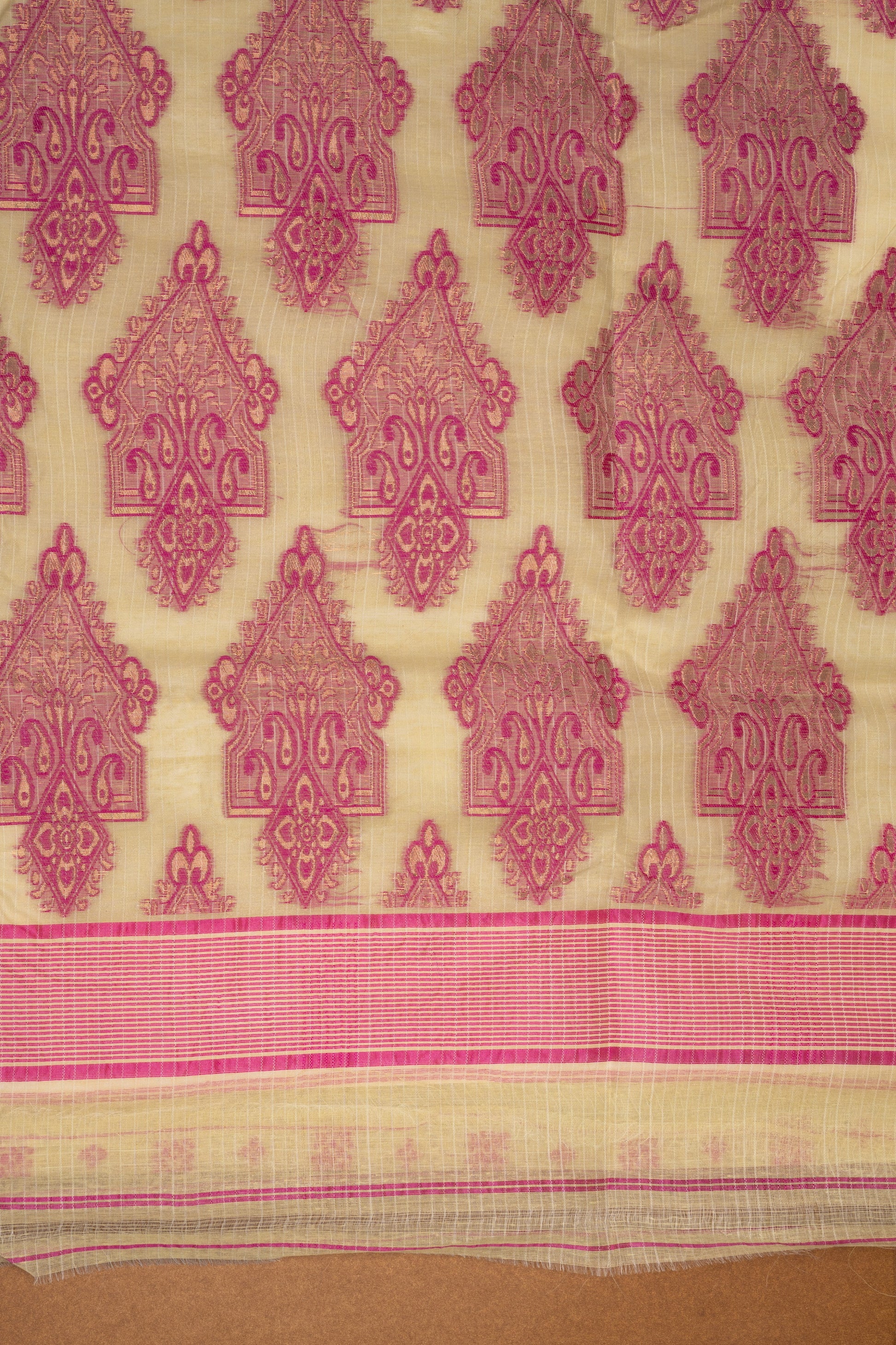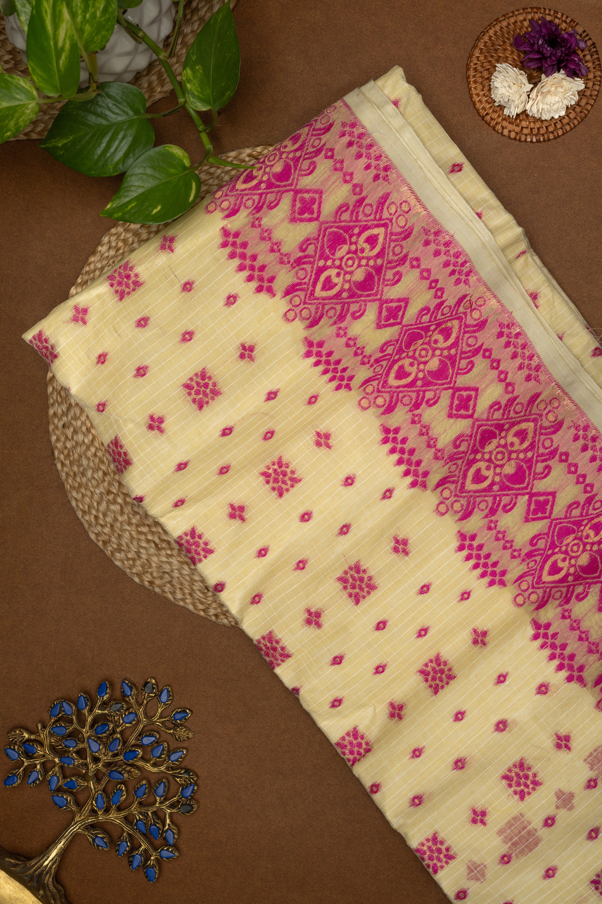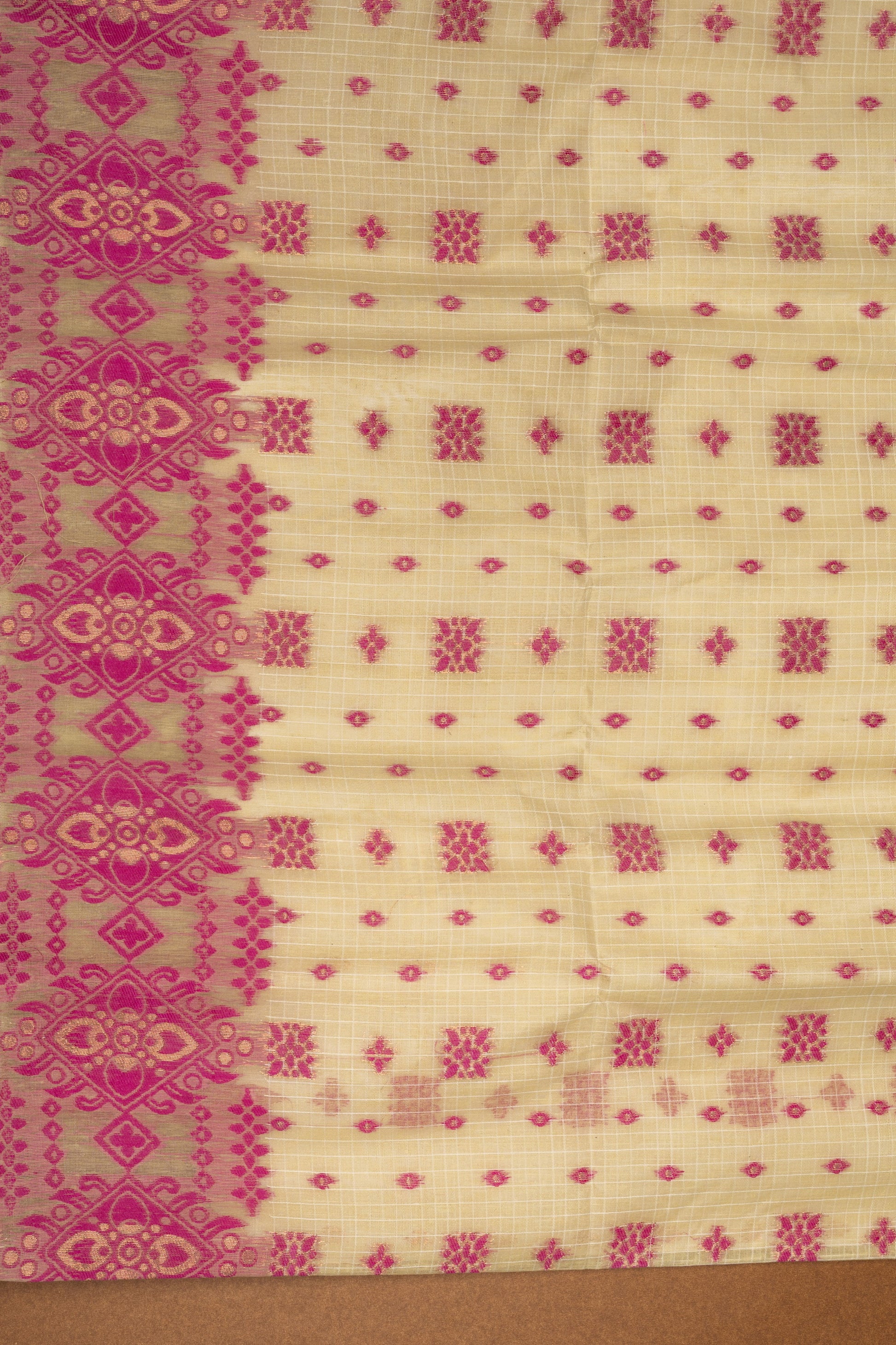 Bathed in the subtle glow of beige, this Jamdani saree is a whisper of heritage woven into every thread. The fabric embodies purity and serenity, reminiscent of ivory sands under golden light. What makes this piece exceptional is its hazar booti motif arrangement—a striking departure from the conventional grid of Jamdani, lending the drape a dynamic rhythm and sense of movement.