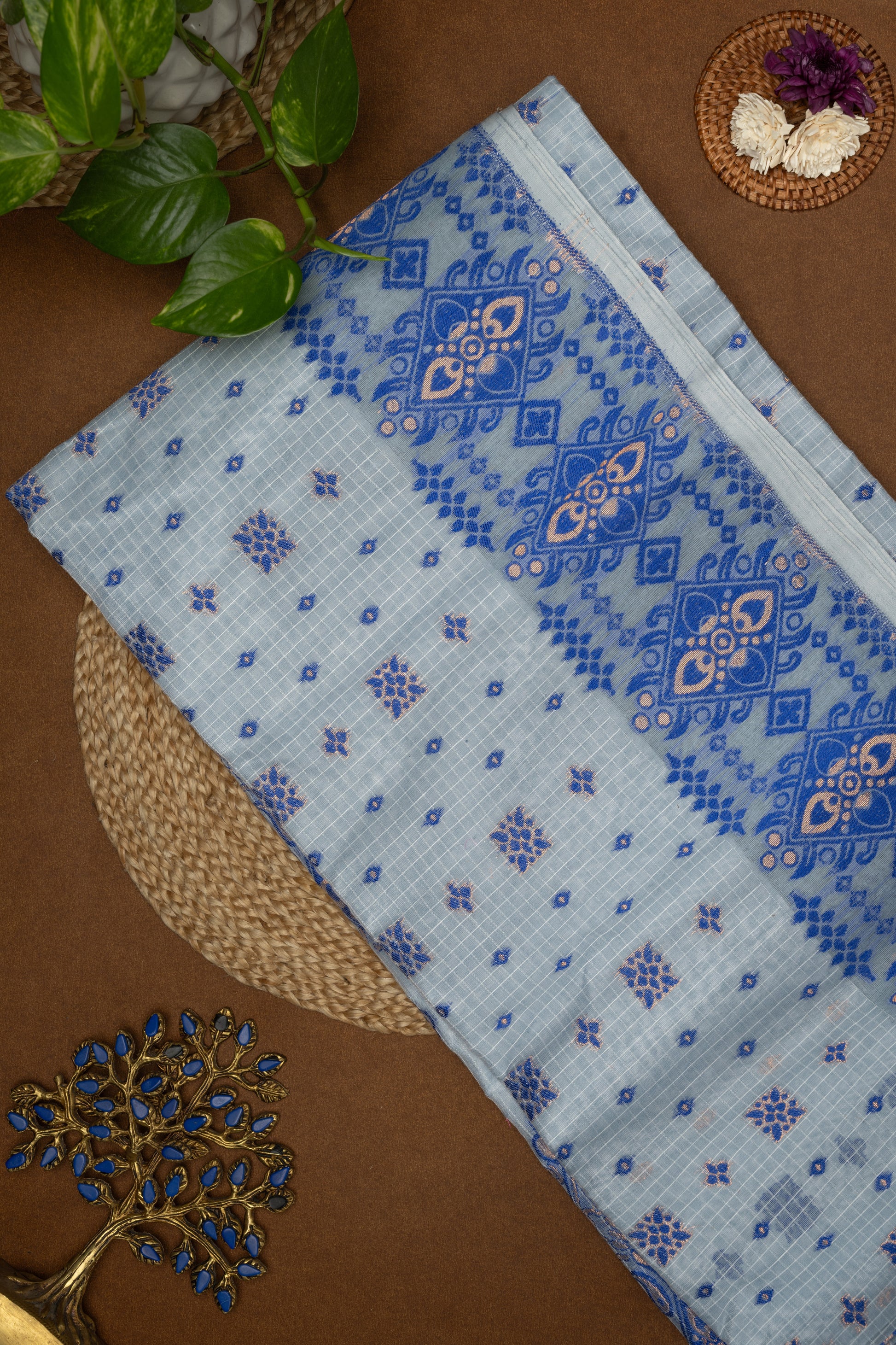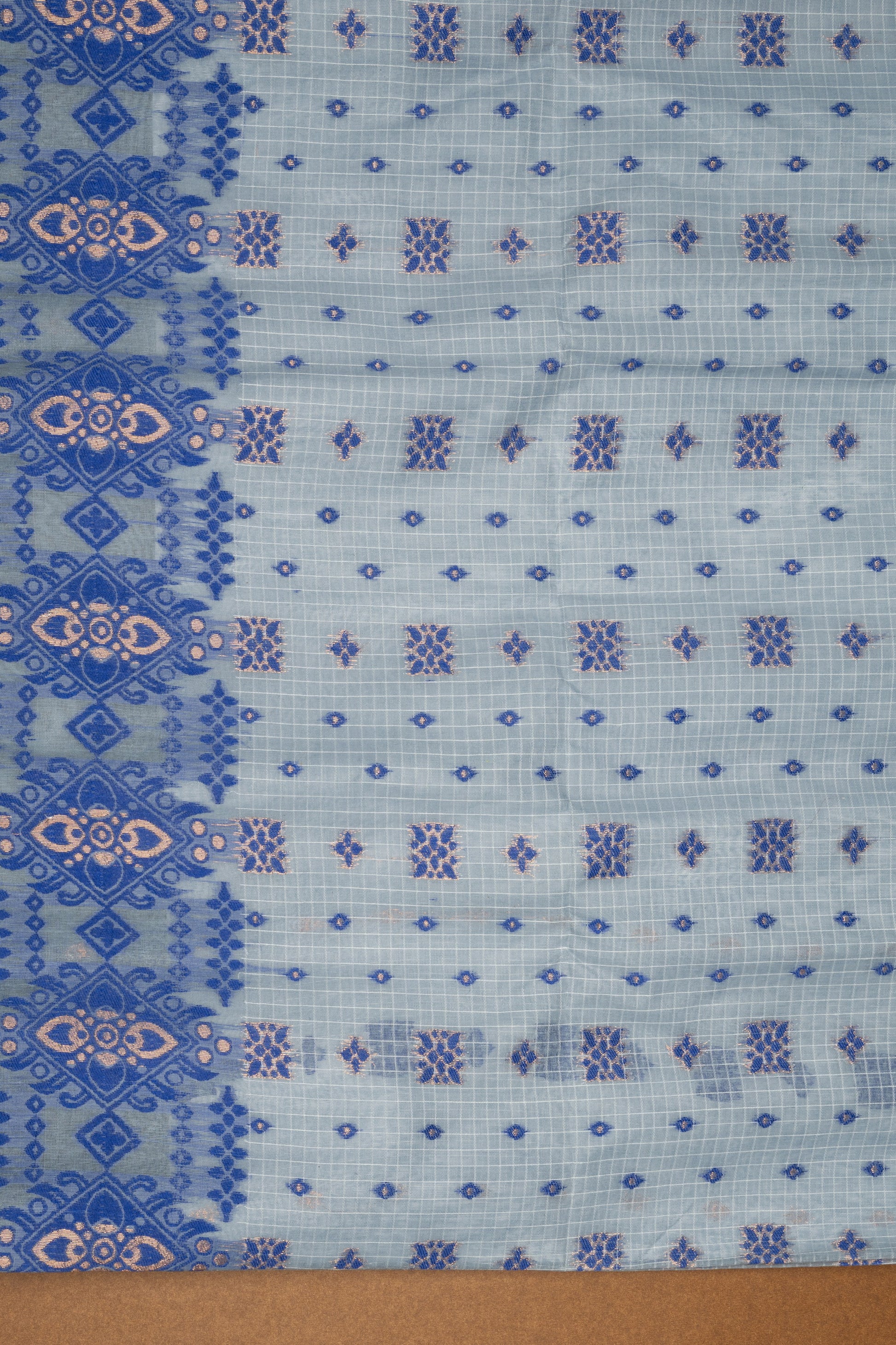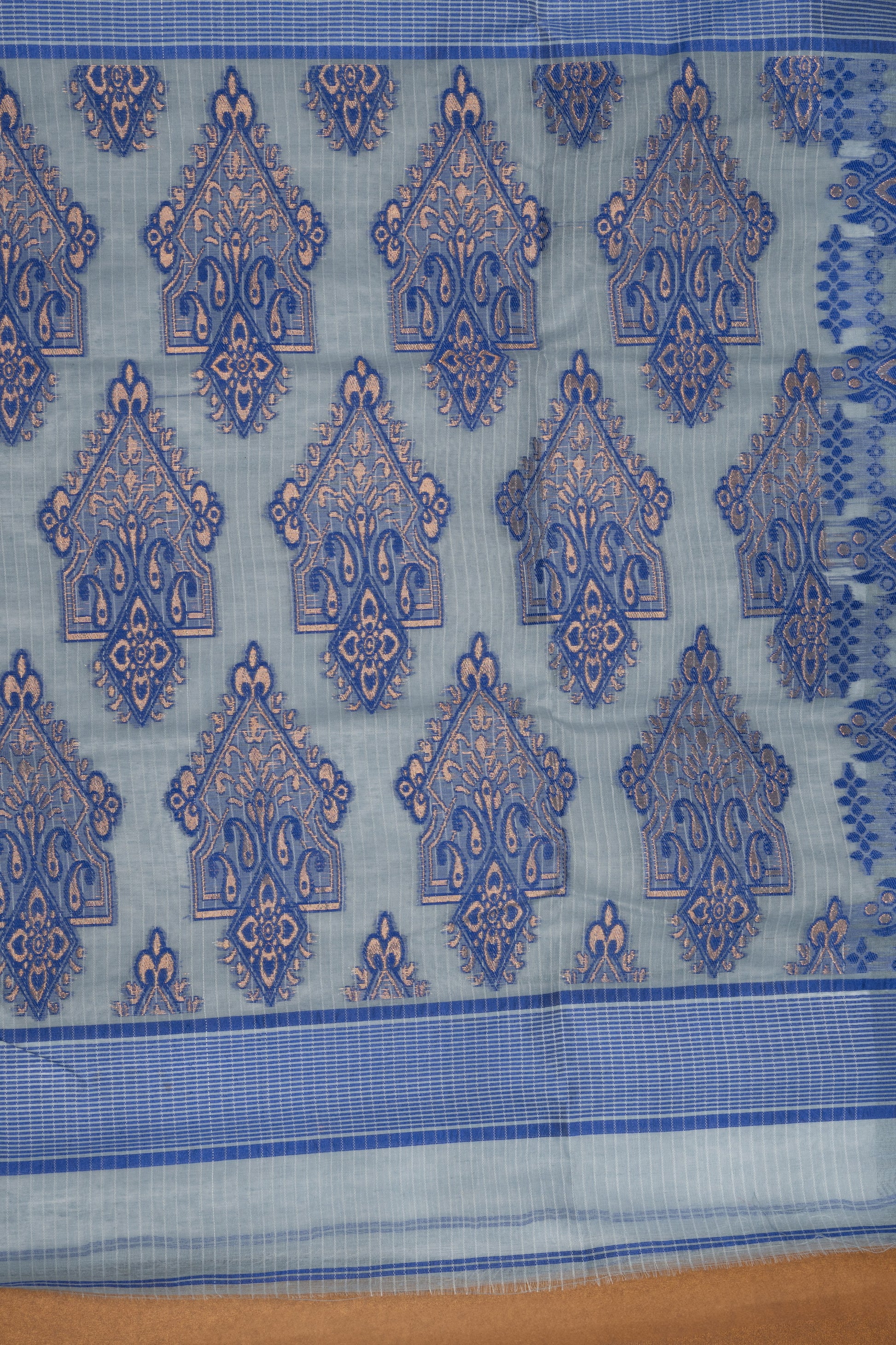Bathed in the subtle glow of grey-blue, this Jamdani saree is a whisper of heritage woven into every thread. The fabric embodies purity and serenity, reminiscent of ivory sands under golden light. What makes this piece exceptional is its hazar booti motif arrangement—a striking departure from the conventional grid of Jamdani, lending the drape a dynamic rhythm and sense of movement.